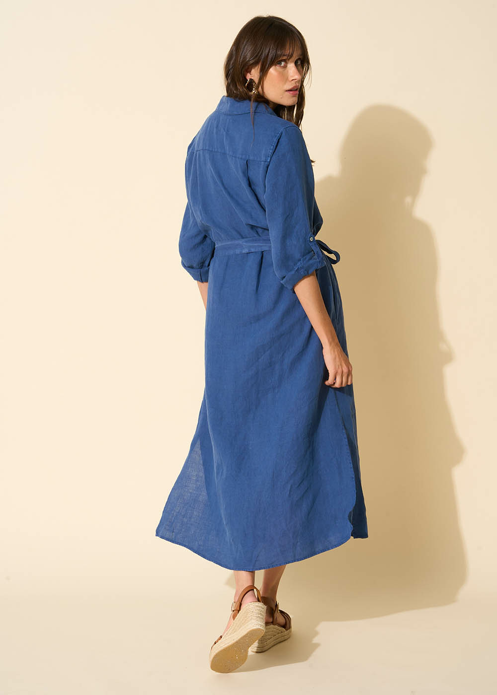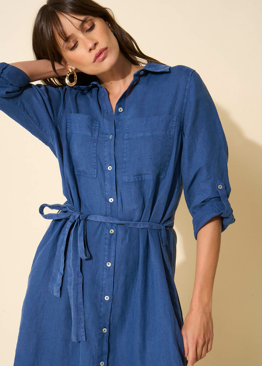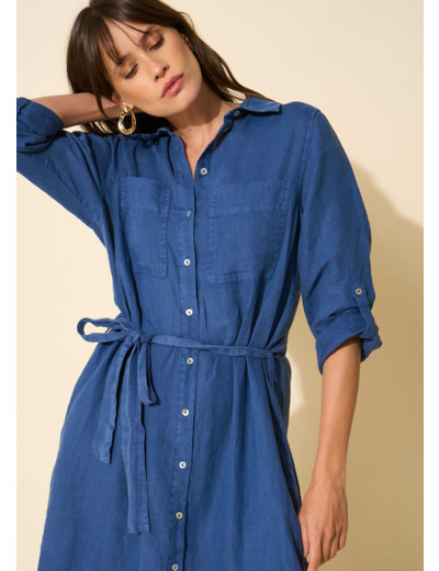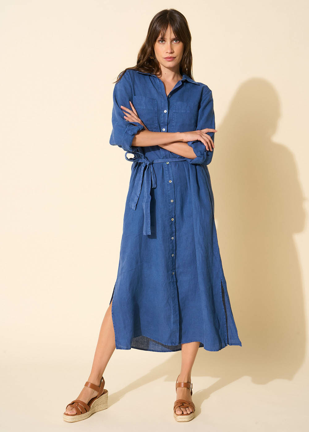La robe midi ROSKALI confectionnée entièrement en lin offre une silhouette chemise décontractée idéale pour ce printemps été. Ses manches longues sont agrémentées de poignets classiques à deux boutons. Une patte de revers ornée d'un bouton et des poches plaquées à l'avant ajoutent des détails raffinés à la pièce. La ceinture amovible permet une personnalisation du look tandis que les fentes en bas de jupe lui apportent une touche moderne.