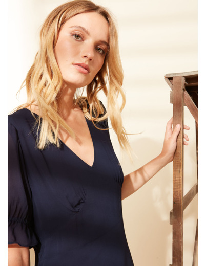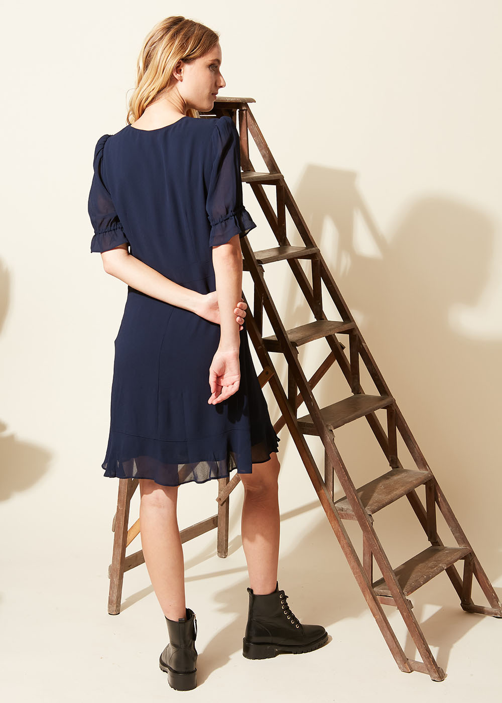 - La robe mini ROZENN est la PARFAITE petite robe marine de la saison ! Cette robe mini à l'encolure V possède des manches courtes volantées élastiquées pour un look raffiné et ultra-féminin. Cette robe mini fluide est composée d'une doublure et est légerement transparente au niveau des bras et du bas de robe.