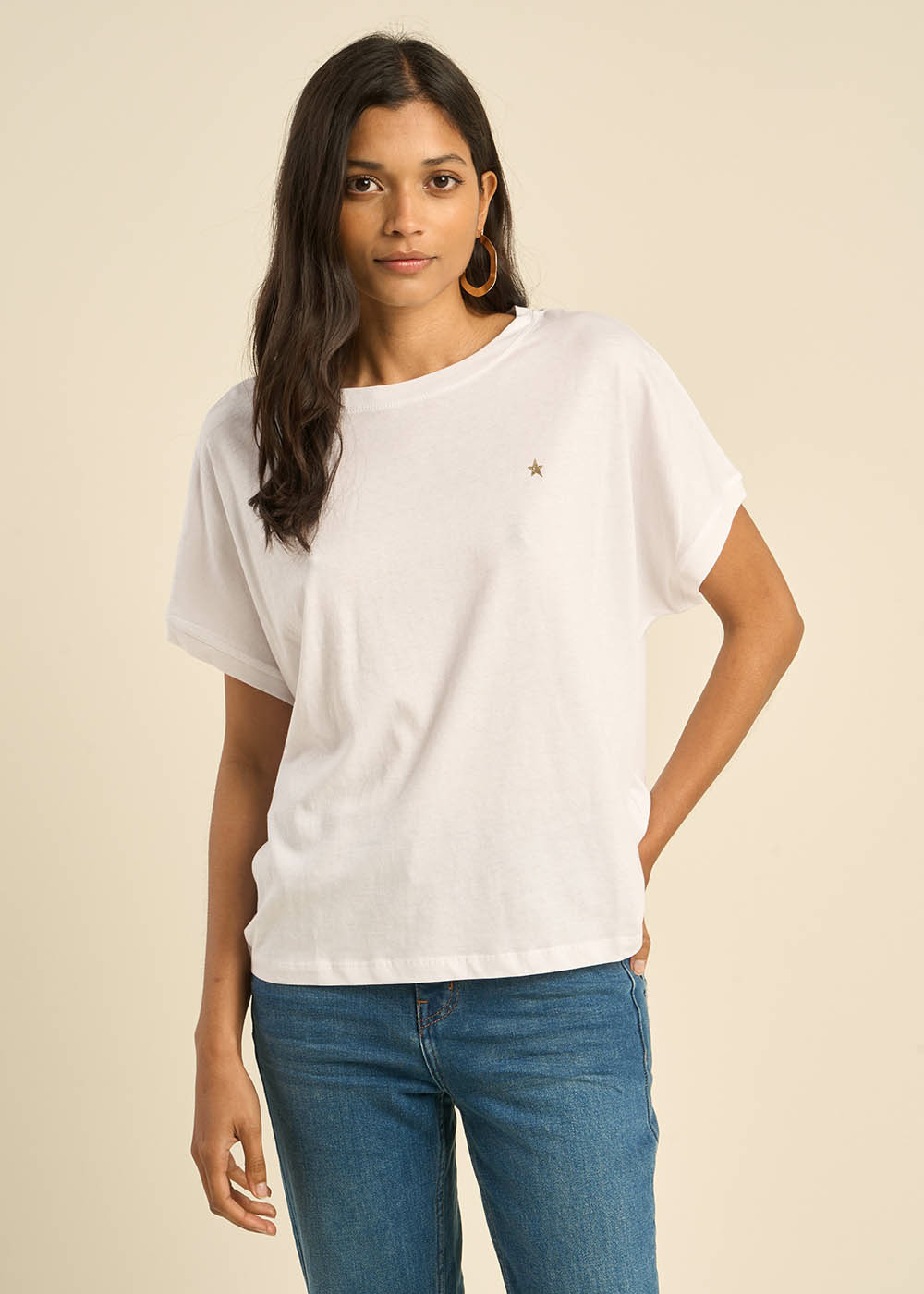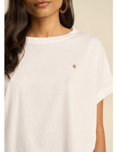 On a toutes besoin d'un tee-shirt à la coupe large pour se sentir bien dans ses vêtements! Le TRICIA coche toutes les cases : manches courtes col rond et 100% coton. Sa petite étoile sur la poitrine le rend unique.