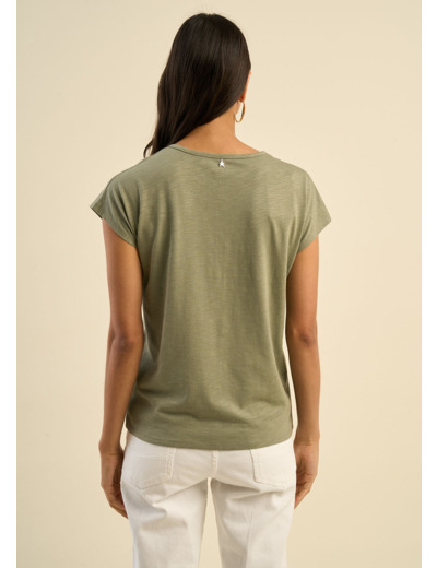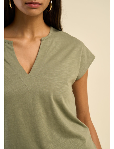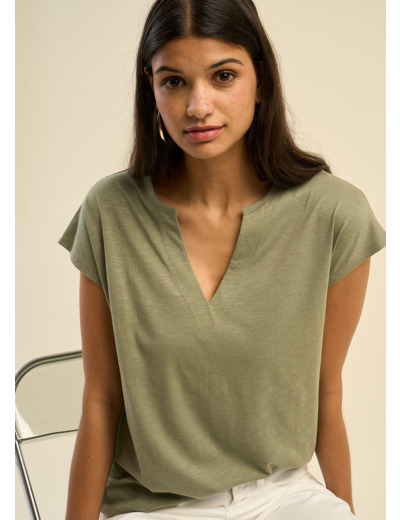 Le t-shirt TERA allie confort et style avec son col tunisien agrémenté d'une surpiqûre en V, apportant une touche moderne et raffinée. Ses manches courtes et son épaule tombante lui confèrent une coupe décontractée et élégante. Ce modèle simple et intemporel se porte aisément avec un jean ou un pantalon léger pour un look à la fois tendance et confortable.