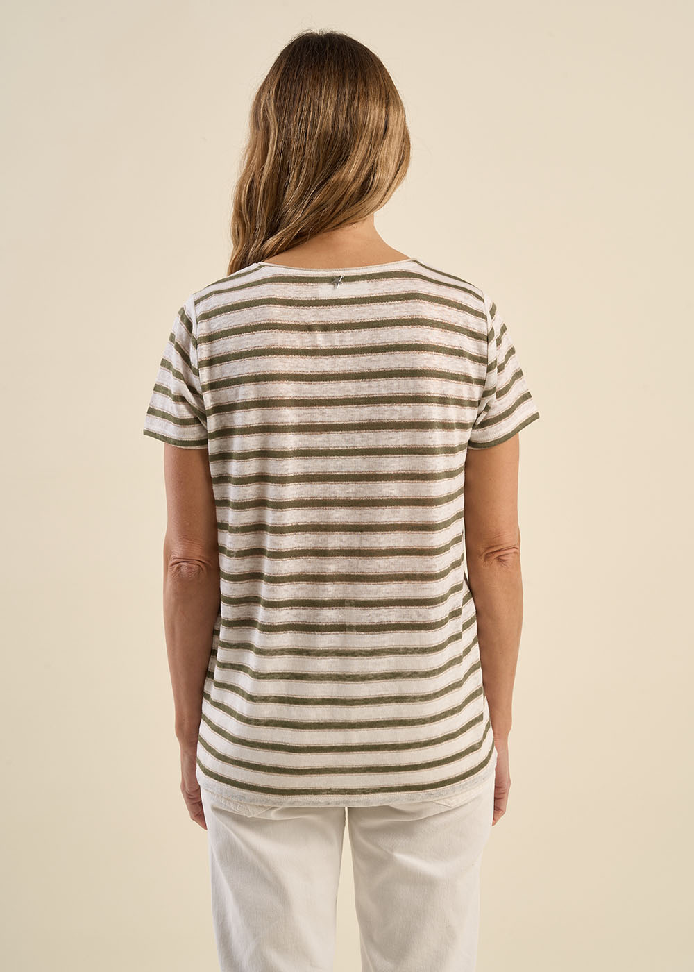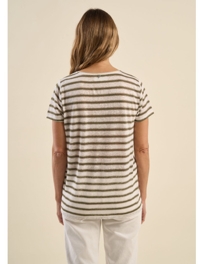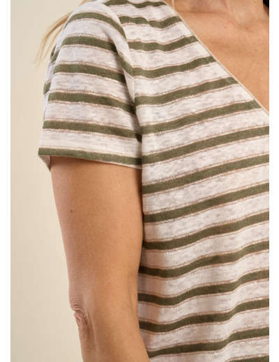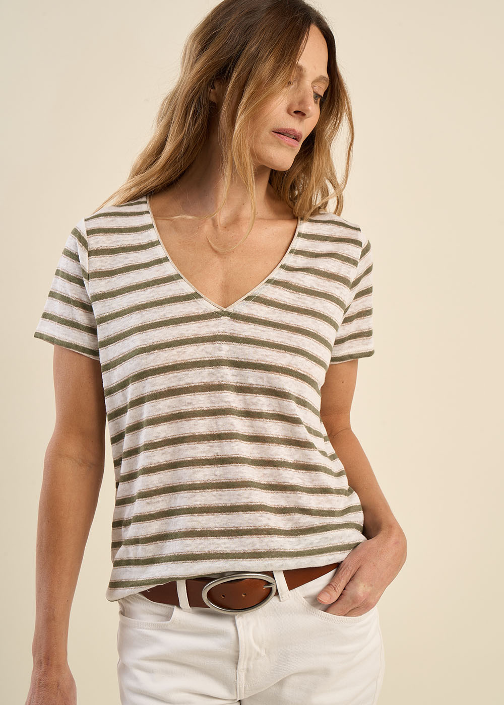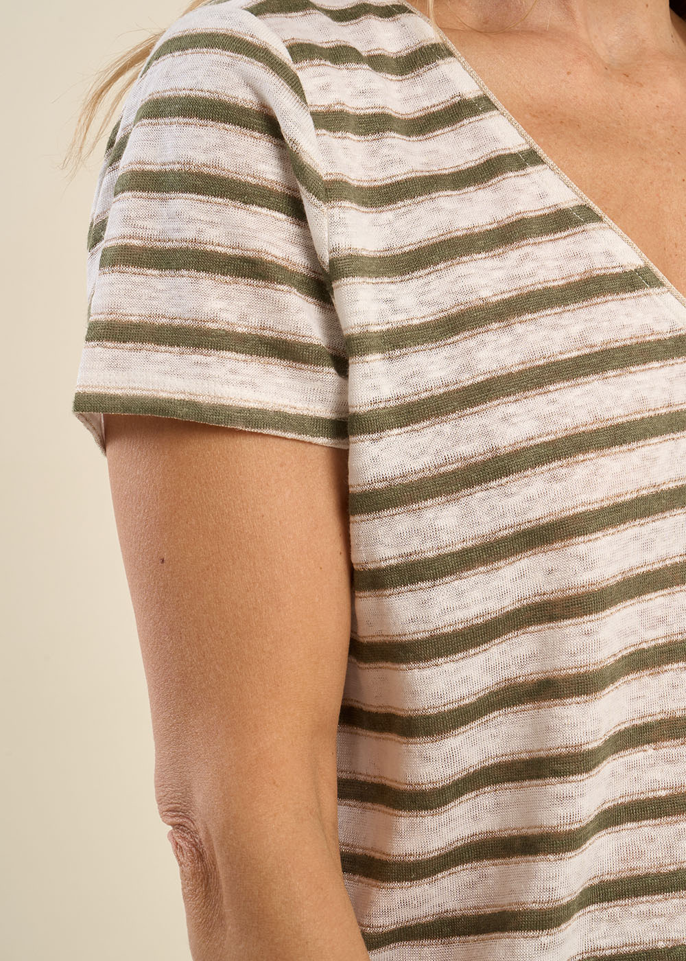Le tee-shirt TANA offre un style décontracté avec ses manches courtes et son col en V agrémenté de rayures marines et de fils lurex silver ajoutant une touche scintillante à cette pièce.