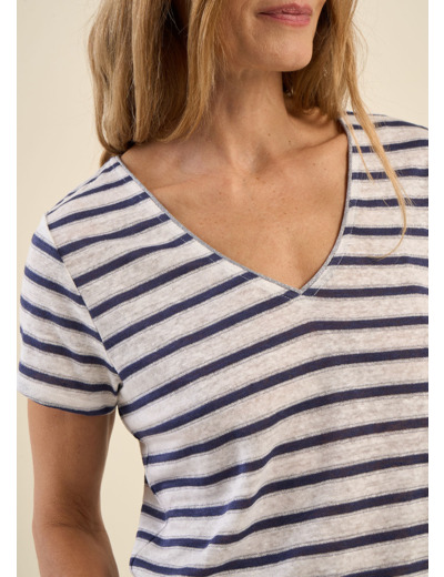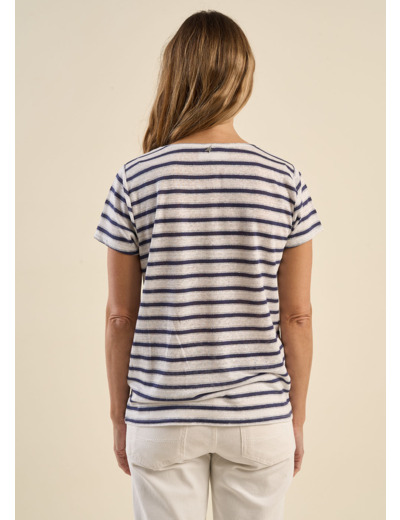 Le tee-shirt TANA offre un style décontracté avec ses manches courtes et son col en V agrémenté de rayures marines et de fils lurex silver ajoutant une touche scintillante à cette pièce.