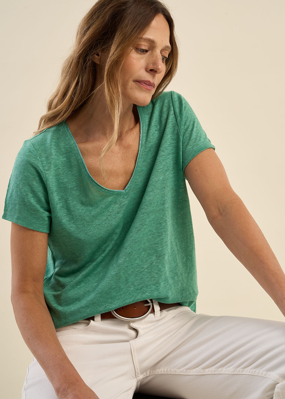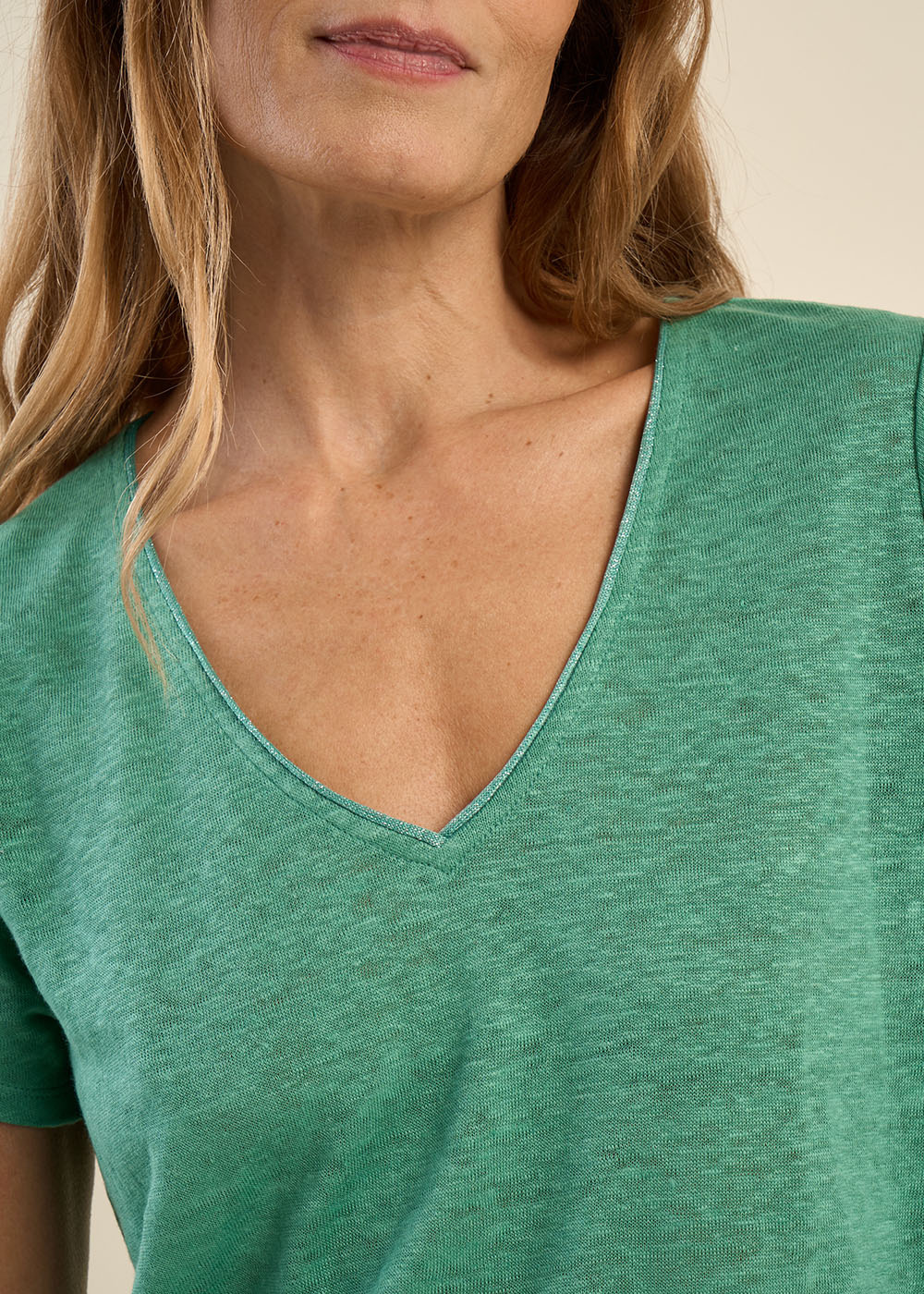 Le tee-shirt TIGROW s'impose comme le nouveau classique alliant simplicité et sophistication. Avec son col V et ses manches courtes il se distingue par une finition en lurex qui rehausse l'encolure d'une touche d'éclat. Polyvalent et élégant le TIGROW se marie aussi bien avec un tailleur décontracté qu'avec un jean.