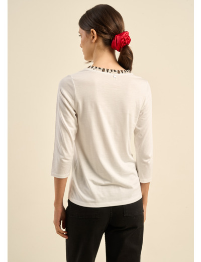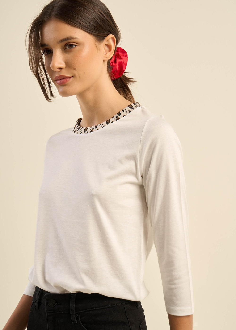 Le t-shirt THILDA à col rond et manches 3/4 se distingue par son bord-côtes imprimé léopard au col. Cette touche audacieuse ajoute une note de style unique à cette pièce confortable et élégante. Parfait pour un look chic et tendance en toute simplicité. Existe en deux coloris.