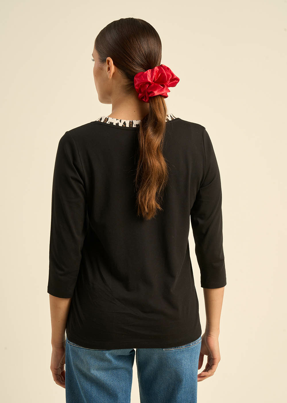 Le t-shirt THILDA à col rond et manches 3/4 se distingue par son bord-côtes imprimé léopard au col. Cette touche audacieuse ajoute une note de style unique à cette pièce confortable et élégante. Parfait pour un look chic et tendance en toute simplicité. Existe en deux coloris.