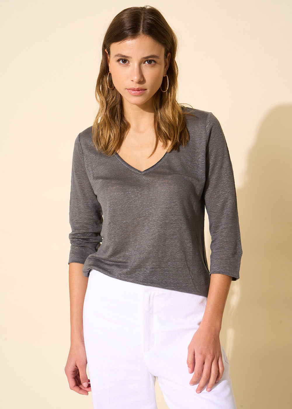 Le tee-shirt TOMEOH redéfinit le classique avec ses manches 3/4 en 100% lin. Il allie simplicité et sophistication avec un col en V flatteur et un détail subtil : un fil lurex qui apporte une touche d'éclat à l'encolure. Polyvalent et raffiné TOMEOH se porte aussi bien avec un tailleur qu'avec un jean.