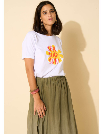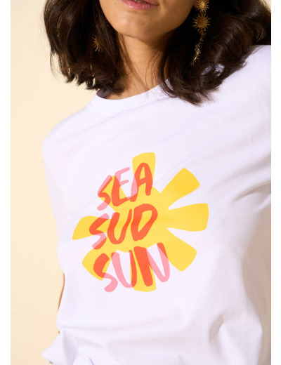 Le tee-shirt TOLEIL présente un motif solaire imprimé avec un col rond et des manches courtes. Associez-le à votre jean en denim préféré pour un look parfait.