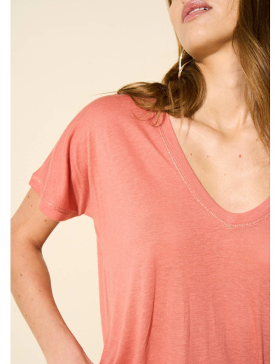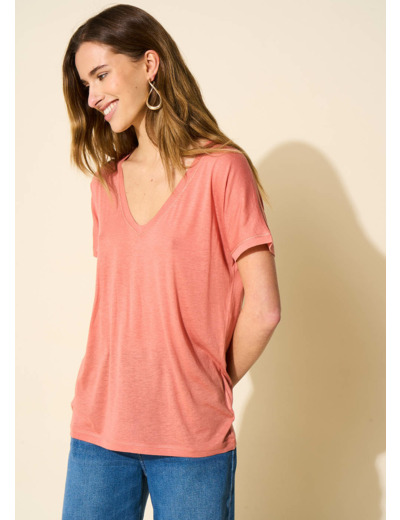 Le tee-shirt TELIZO offre une coupe oversize avec des manches courtes et un col en V alliant confort et style en une seule pièce. Associez-le à un pantalon taille haute et des mocassins pour un look branché au quotidien.