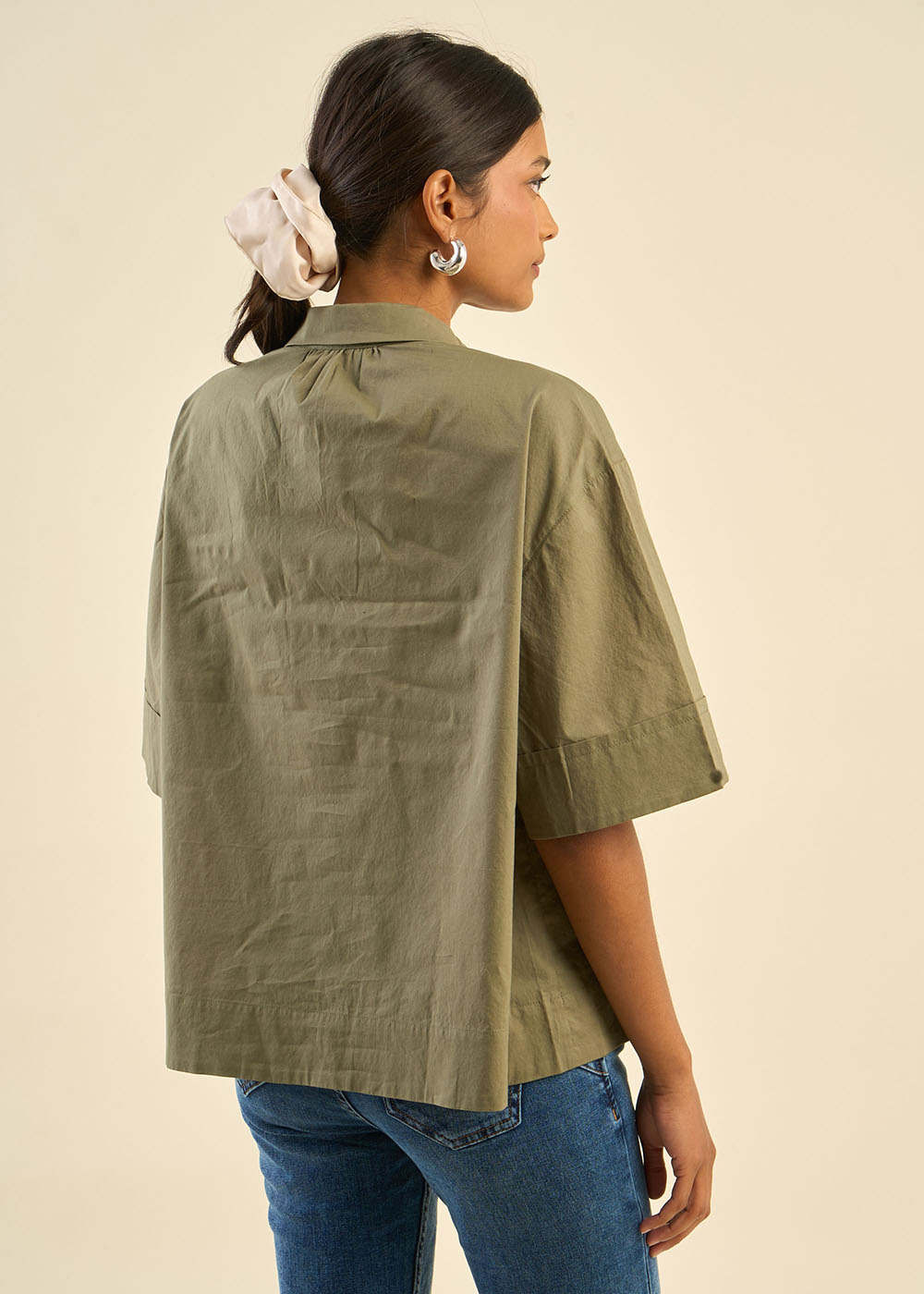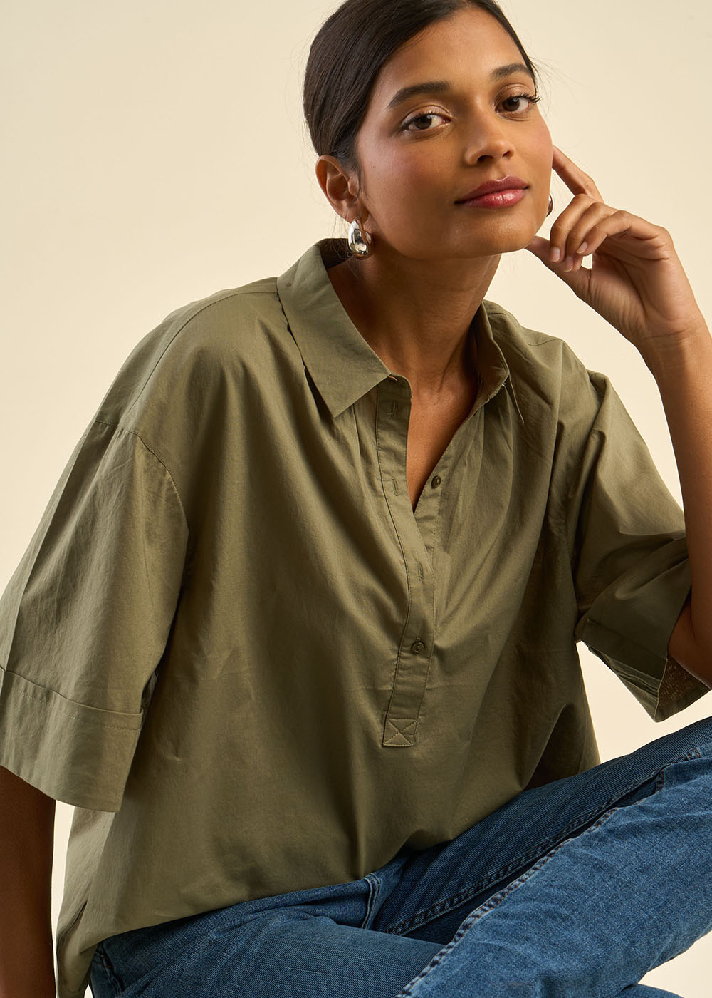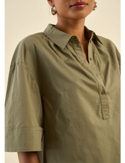 Le top CHELSIA allie confort et style avec son col polo délicatement froncé, apportant une touche originale et élégante. Confectionné en 100% coton, il offre une sensation de douceur tout au long de la journée. Ses manches courtes avec gros revers et sa coupe ample en font une pièce légère et fluide. Le détail des fronces au niveau du pied de col ajoute une note subtile et féminine. Il se porte facilement avec un jean pour un look à la fois simple et élégant.