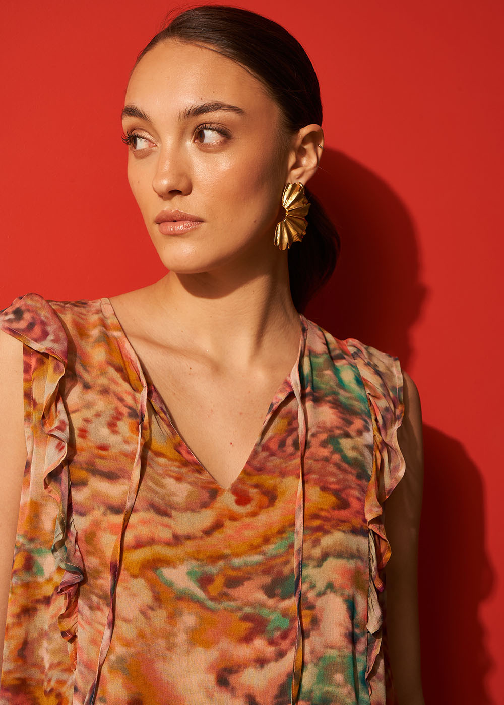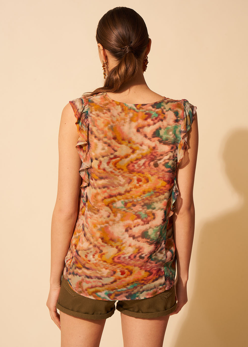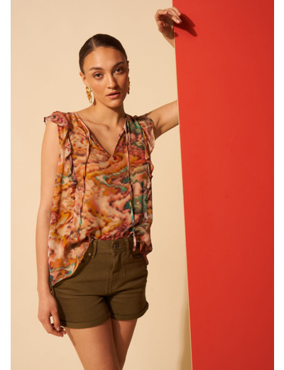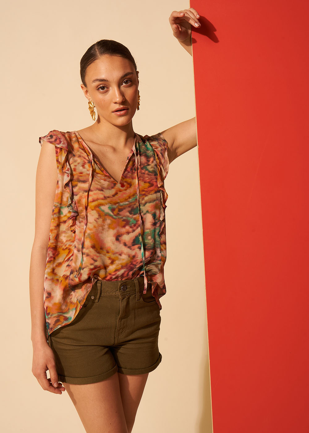 Découvrez ce top imprimé camouflage multicolore. Avec son encolure tunisienne et ses liens de cordages le TANICA est une pièce avec du caractère. Le top détient des emmanchures Sans manches avec des volants.