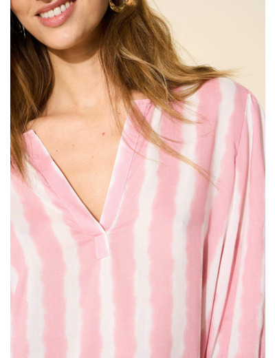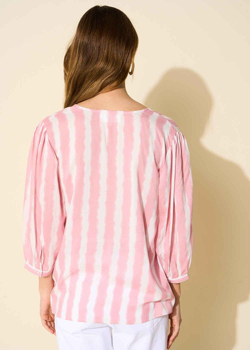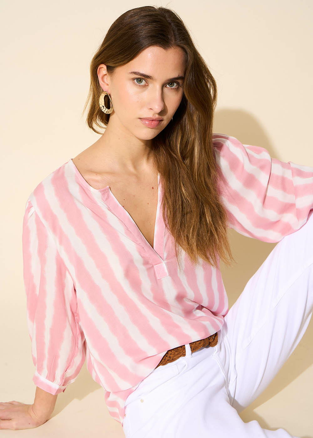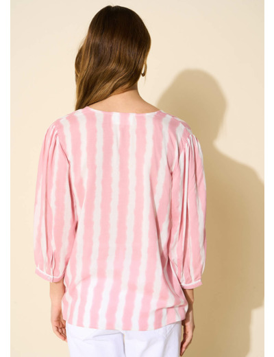 Le top TARINO offre une élégance indéniable avec son col tunisien et sa patte de boutonnage à l'avant. Ses manches 3/4 sont agrémentées de fronces aux épaules et au bas, accompagnées d'un poignet classique à un bouton et d'une fente qui ajoutent une touche sophistiquée à ce vêtement polyvalent.