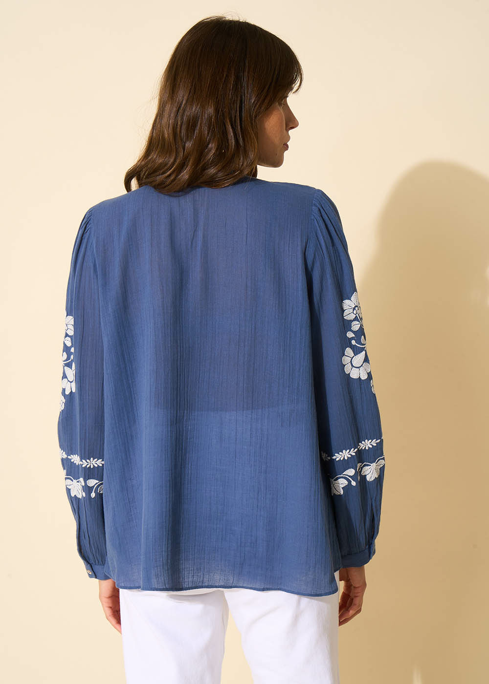 Le top TISIS oversize présente un col tunisien avec un lien à pompons créant une ambiance bohème. La patte brodée sur l'encolure ajoute une touche élégante tandis que les manches longues brodées avec un bouton et une fente offrent un style ajustable. Associez le top TISIS avec un jean décontracté et des sandales pour un look bohème chic parfait pour une journée estivale.