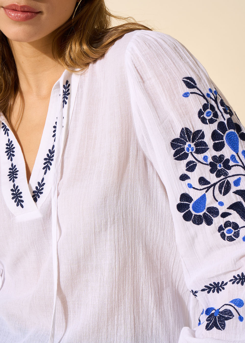 Le top TISIS oversize présente un col tunisien avec un lien à pompons créant une ambiance bohème. La patte brodée sur l'encolure ajoute une touche élégante tandis que les manches longues brodées avec un bouton et une fente offrent un style ajustable. Associez le top TISIS avec un jean décontracté et des sandales pour un look bohème chic parfait pour une journée estivale.