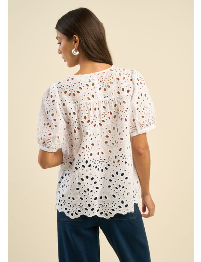 Le top TALISA est une pièce forte et élégante, idéale pour un look bohème chic en journée comme en soirée. Confectionné en broderie anglaise, il séduit par son col V raffiné et sa coupe ample qui assure confort et fluidité. Ses manches courtes bouffantes et son bas façon veston apportent une touche structurée et mode. Sa matière 100% coton garantit une qualité haut de gamme et un tombé impeccable.