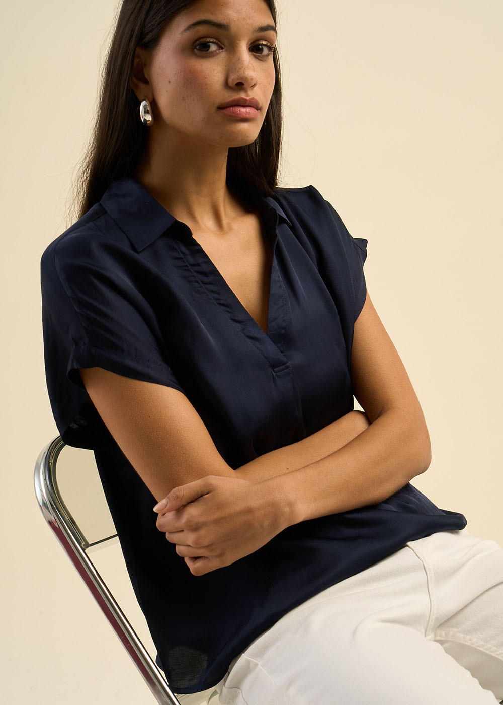Le top TOSKANA allie élégance décontractée et modernité. Conçu dans une coupe ample et fluide, il offre un confort absolu tout en sublimant la silhouette. Son col chemisier structuré et son décolleté en V apportent une touche sophistiquée et féminine. Les manches courtes à emmanchures tombantes confèrent une allure minimaliste et épurée, parfaite pour un look chic et intemporel.