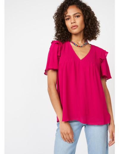 Top col V et manches courtes à volants