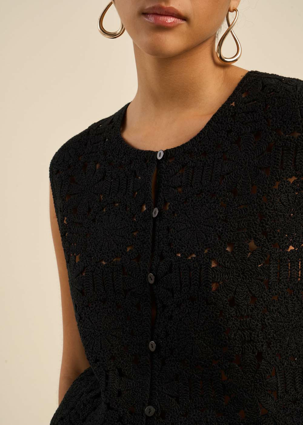 Le gilet GUIBSON est une pièce délicate qui apporte une touche bohème et sophistiquée à votre dressing. Travaillé en maille ajourée, il dévoile un motif raffiné au charme vintage. Sa coupe sans manches et son encolure ronde lui confèrent une allure à la fois élégante et décontractée. Fermé par de jolis boutons nacrés, il peut se porter seul pour un effet structuré ou en superposition sur une blouse légère pour un look tout en subtilité.