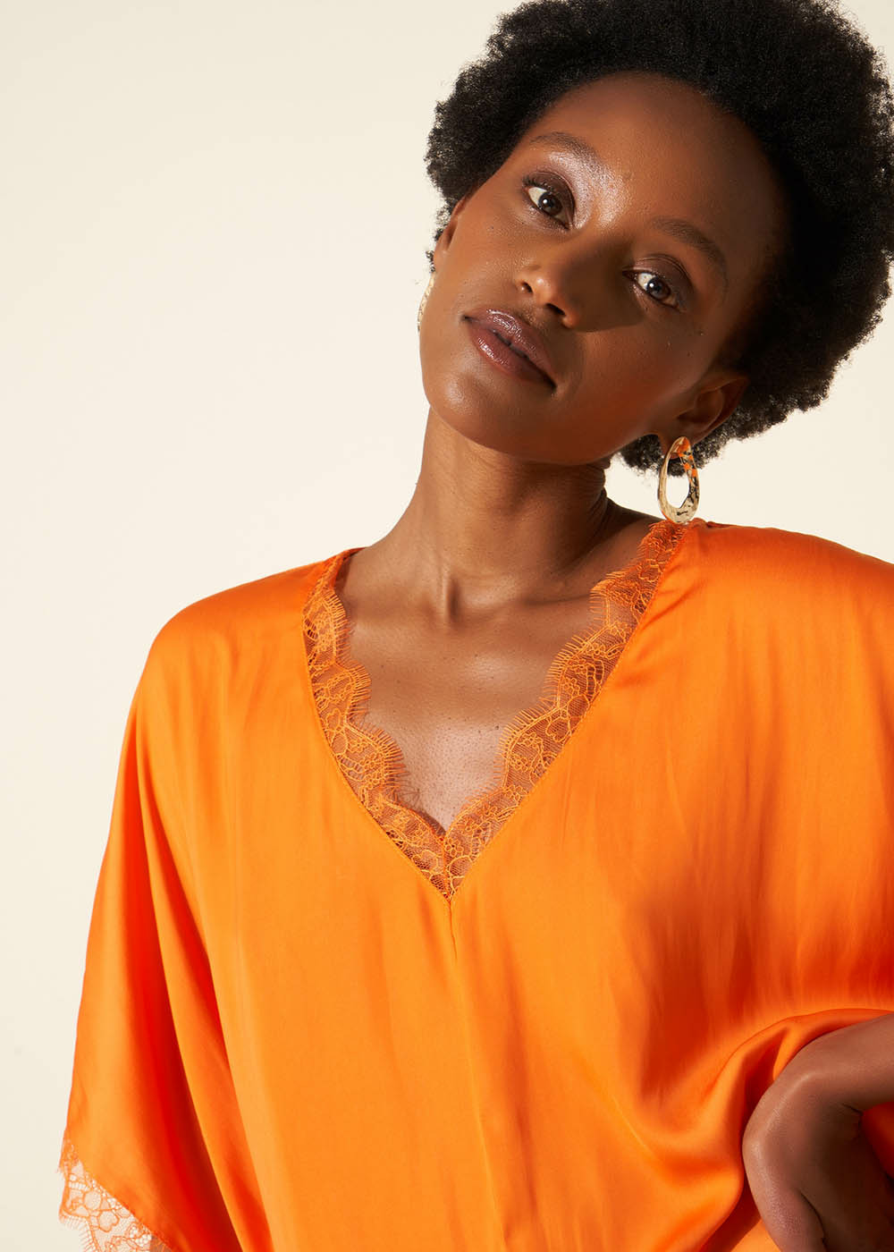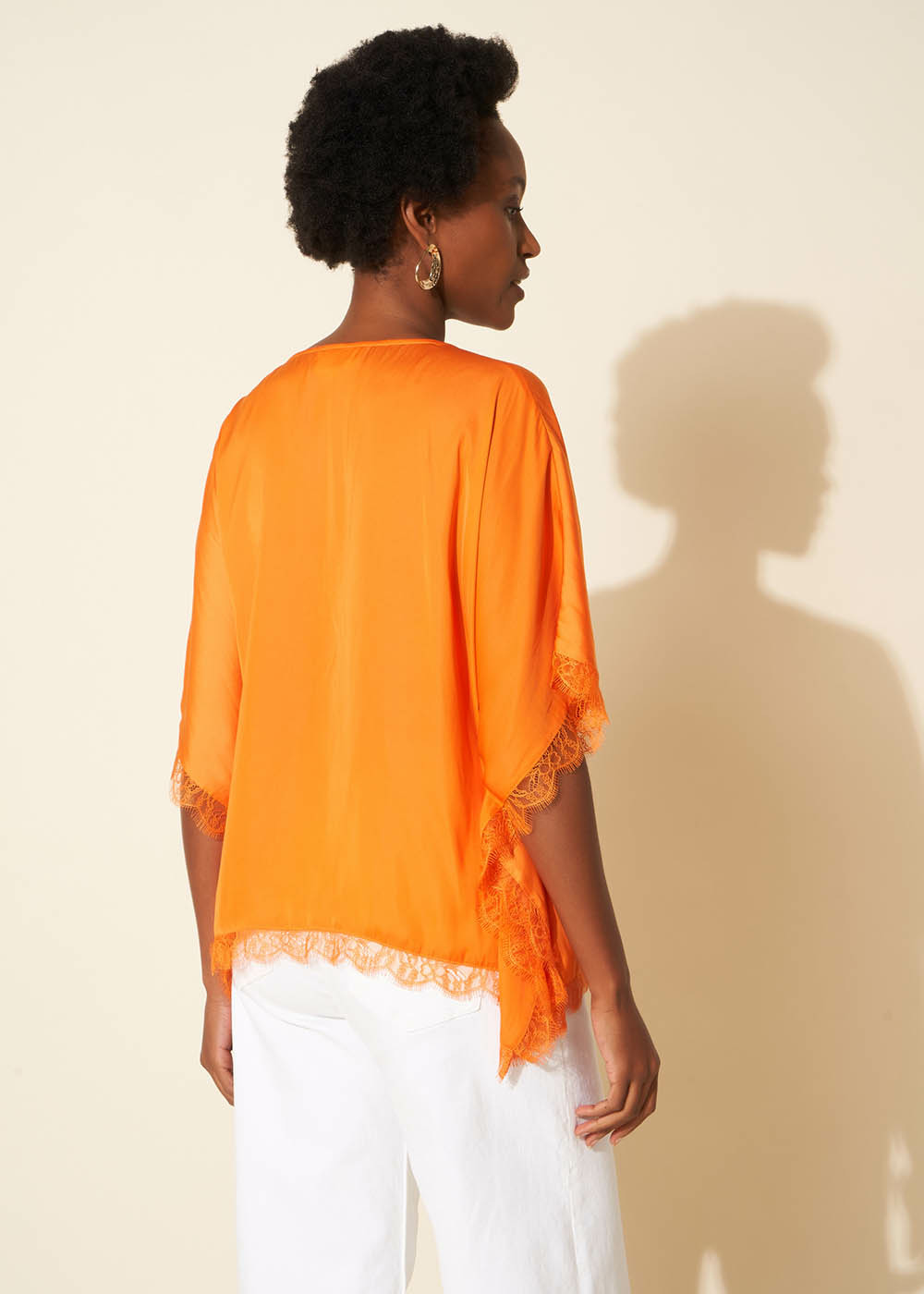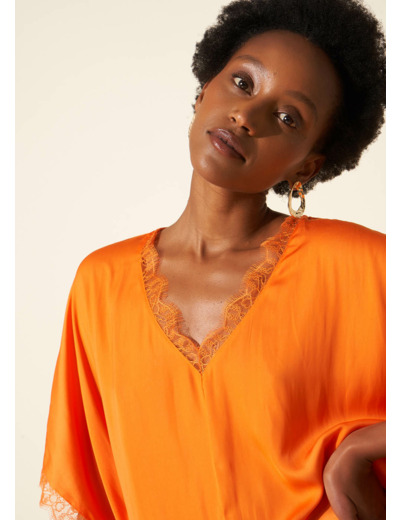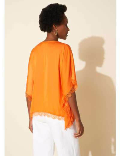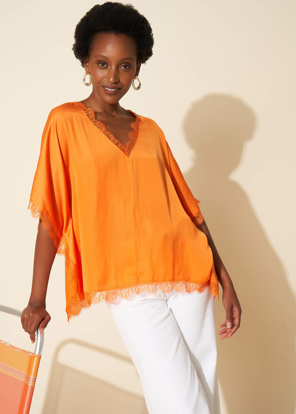 Le top TOBALCO oversize doté d'un col en V et de manches tombantes se distingue par une bande de dentelle subtile au niveau du col sur les côtés et en bas du top créant une pièce décontractée et féminine avec une touche élégante.