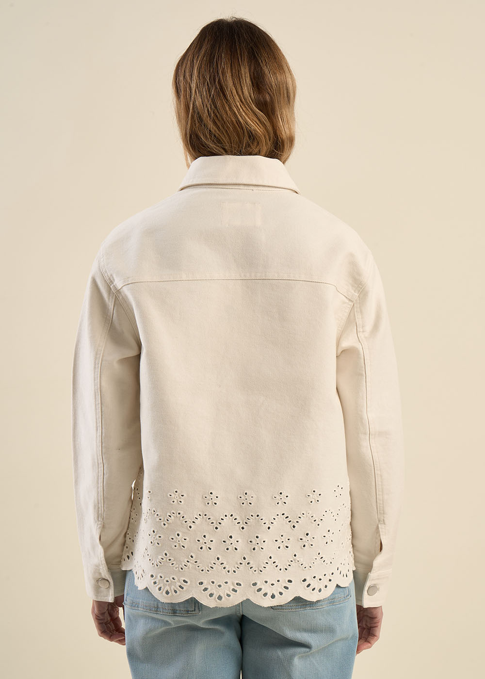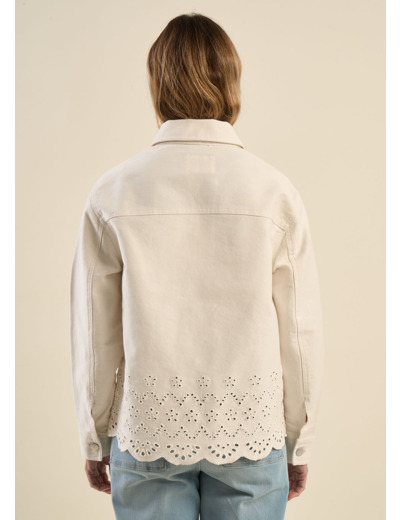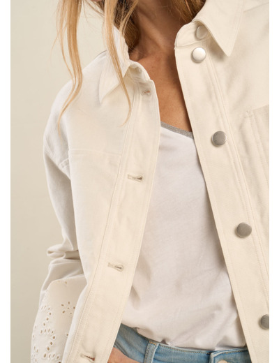 La veste VEDETTE mêle élégance et originalité avec ses jolies bordures et sa broderie anglaise ajourée, qui lui donne un côté raffiné. Sa coupe, qui suit les lignes des épaules, intègre des poches discrètes, laissant ainsi le motif se mettre en valeur. Ce modèle structuré et féminin se porte facilement avec une robe ou un pantalon pour un look chic et intemporel.