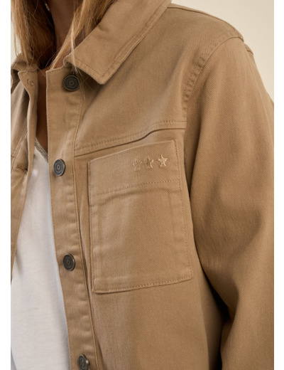 La veste VIOLINE revisite le style workwear avec des détails soignés et une coupe moderne. Son col chemise et son ouverture milieu devant, fermée par des boutons jaspet, lui confèrent une allure intemporelle. Une découpe subtile à la carrure structure la silhouette, tandis que les poches plaquées à rabats boutonnés ajoutent à la fois style et fonctionnalité. Les poignets boutonnés offrent une finition élégante, et les trois petites étoiles brodées sur la poche apportent une touche distinctive.