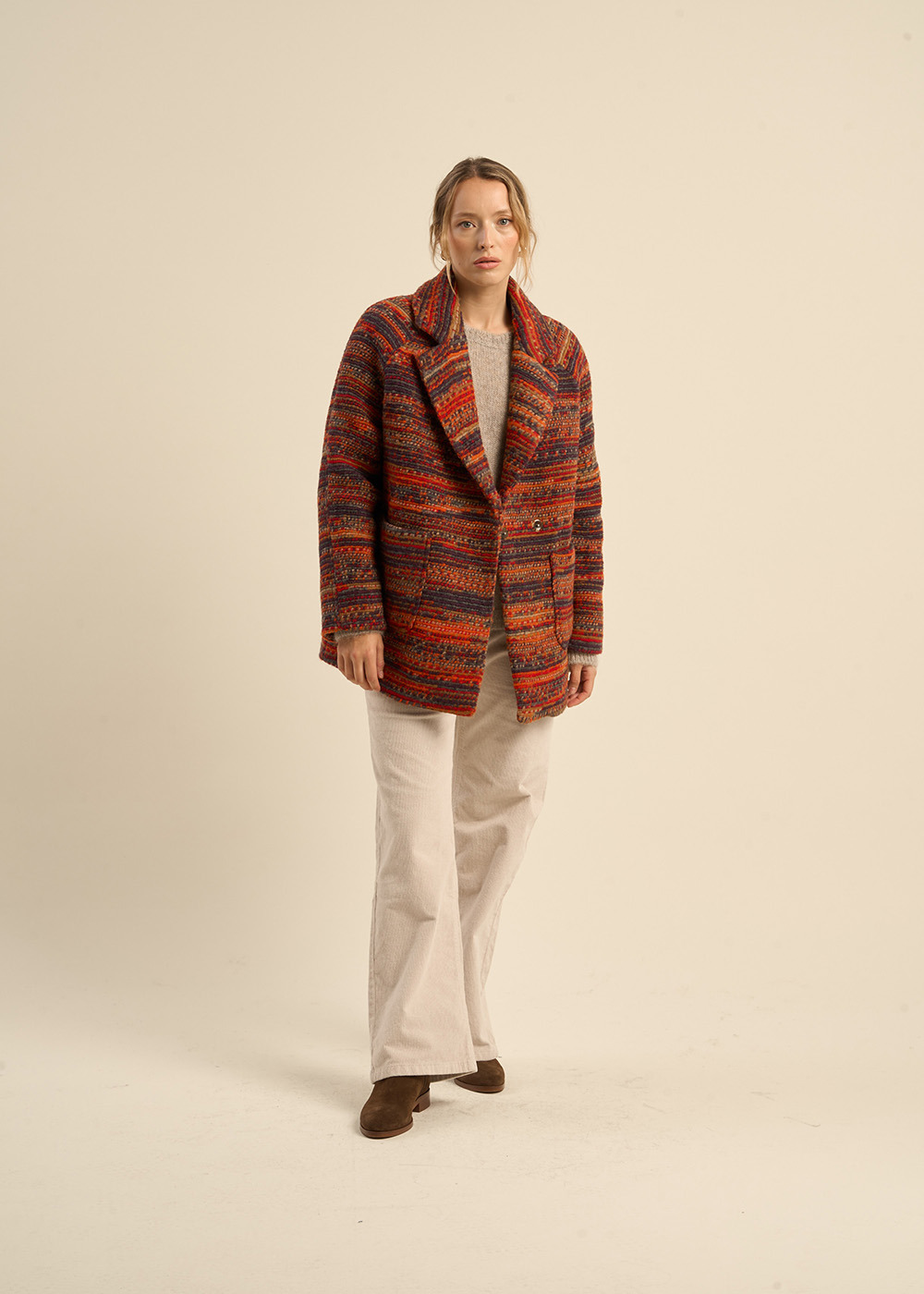 Le manteau MISTY est un modèle court en laine qui allie élégance et confort. Conçu avec des manches raglan pour une coupe moderne et une liberté de mouvement optimale, il présente un col tailleur classique qui ajoute une touche de sophistication. Les poches plaquées à l'avant sont à la fois pratiques et esthétiques.