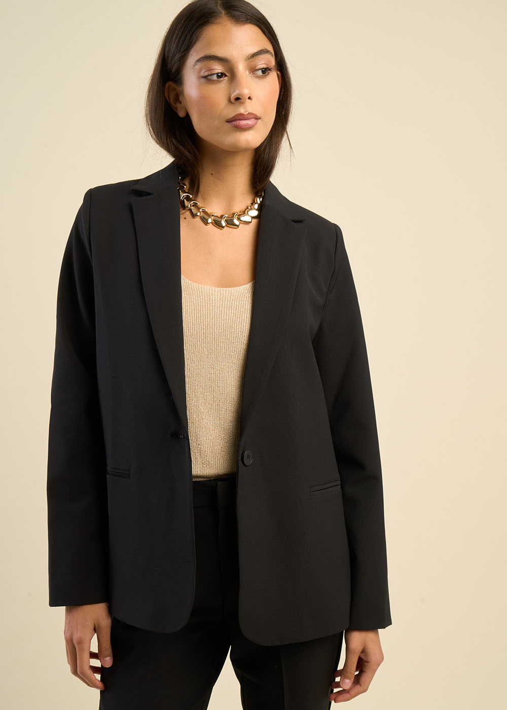 La veste VEDELINE, un véritable caméléon. Sa coupe intemporelle et sa matière noble lui permettent de se marier avec toutes les pièces de votre garde-robe. Portée avec le pantalon PELAGIE, elle crée un ensemble tailleur élégant, tandis qu'associée au pantalon PAULIN, elle offre un look plus décontracté. Un basique polyvalent qui s'adapte à toutes les occasions