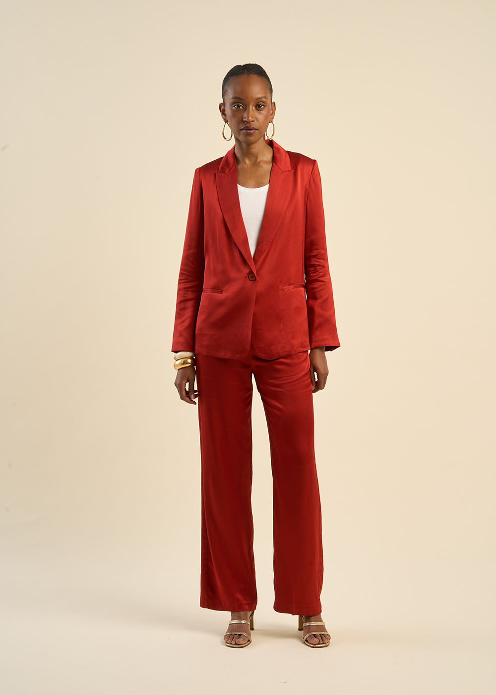 La veste VATINY, en satin fluide et raffiné, est l’incarnation du chic moderne. Sa coupe droite et son tissu élégant en 100 % viscose en font une pièce idéale pour les tenues habillées. Portée avec le pantalon PATY, elle compose un ensemble sophistiqué, tandis qu'associée à un pantalon large, elle crée une silhouette fluide et tendance. Entièrement doublée et dotée d’une fente discrète au dos, elle allie confort et élégance pour s’adapter à toutes les occasions.
