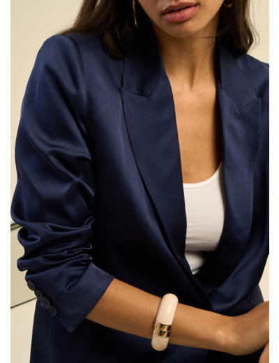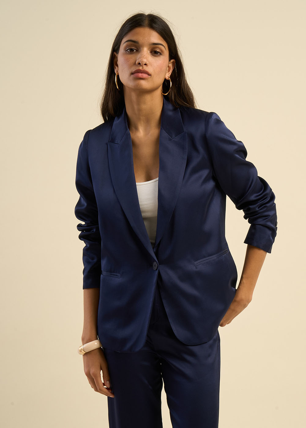 La veste VATINY, en satin fluide et raffiné, est l’incarnation du chic moderne. Sa coupe droite et son tissu élégant en 100 % viscose en font une pièce idéale pour les tenues habillées. Portée avec le pantalon PATY, elle compose un ensemble sophistiqué, tandis qu'associée à un pantalon large, elle crée une silhouette fluide et tendance. Entièrement doublée et dotée d’une fente discrète au dos, elle allie confort et élégance pour s’adapter à toutes les occasions.