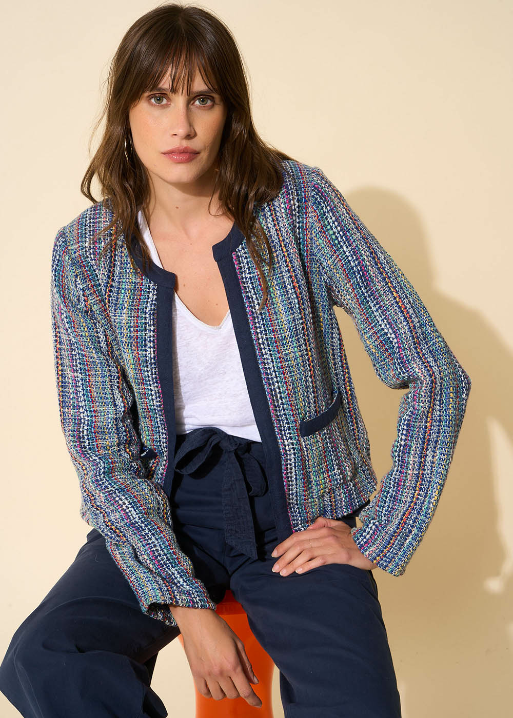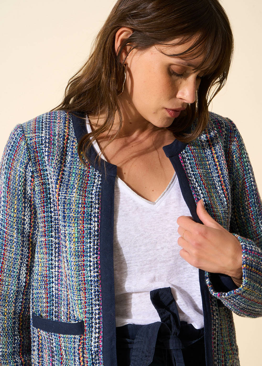 La veste VAHALA est remarquable pour son tweed multicolore délicat. Elle est équipée de manches longues, de poches plaquées à l'avant et de finitions ornées de galons à l'encolure, au centre et sur l'ouverture. Associez-la à une chemise blanche légère pour un look parfaitement assorti.