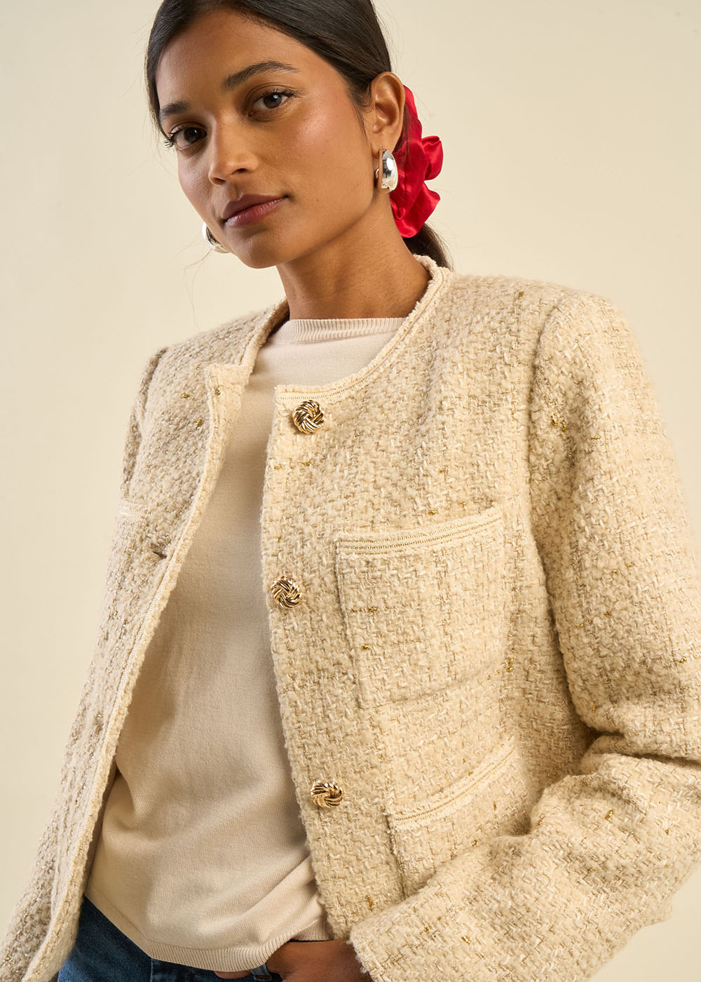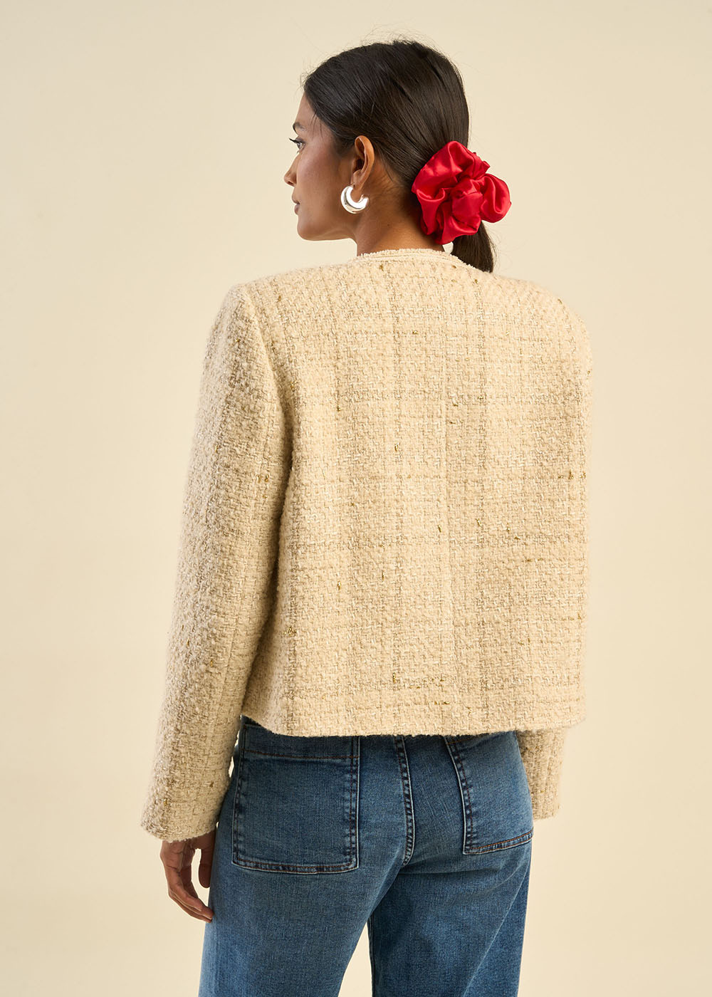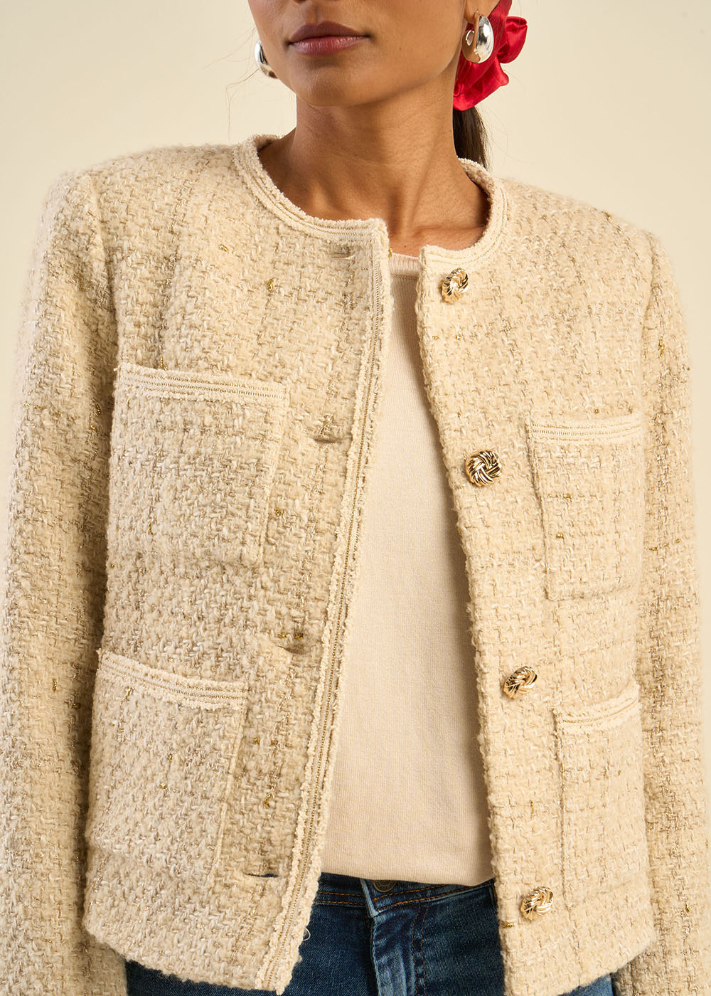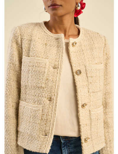 La veste VASSIONY incarne le chic intemporel avec une touche contemporaine. Confectionnée en tweed texturé avec un fil lurex, elle offre une allure sophistiquée. Son col rond et son ouverture devant, sublimée par des boutons bijoux, ajoutent une note élégante. Les 4 poches plaquées apportent du caractère tout en restant fonctionnelles, tandis que la coupe courte et droite affine la silhouette.
