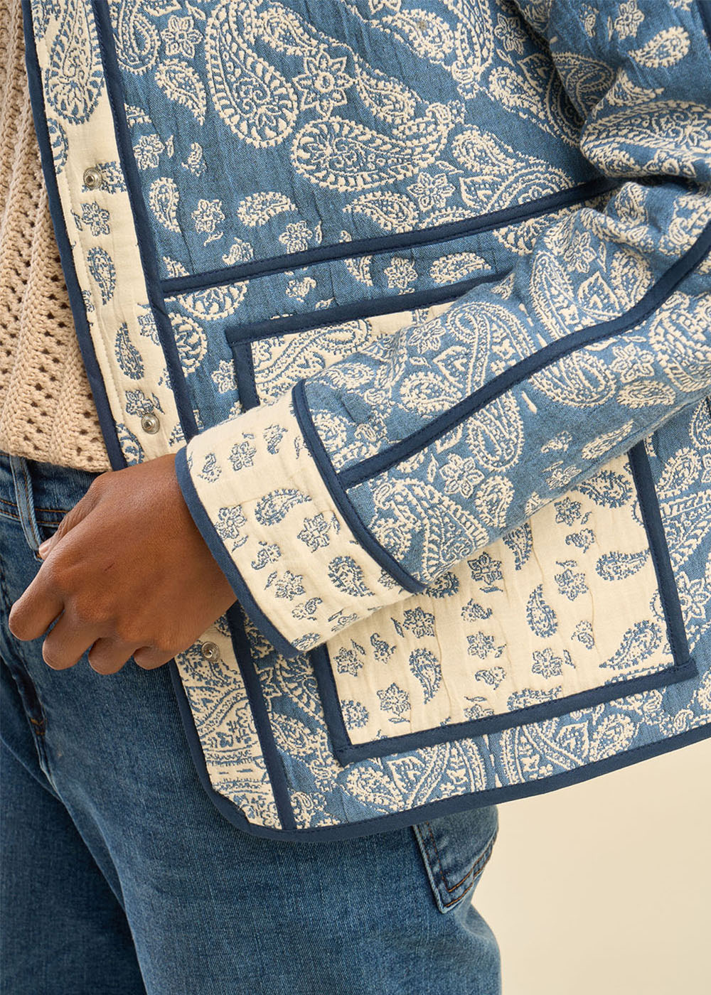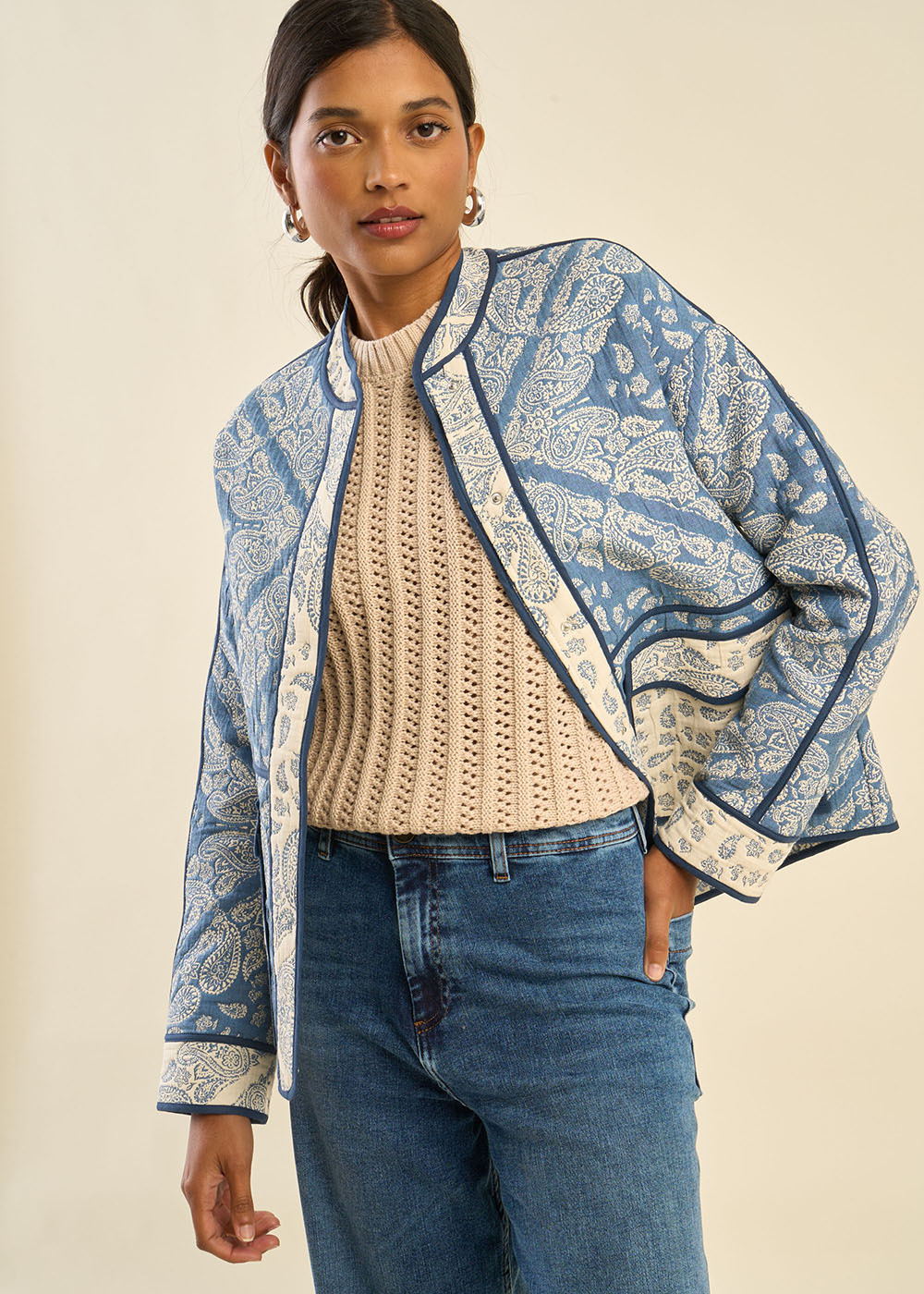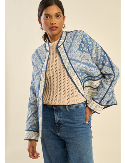 Veste jacquard motif bandanaCol mao et épaules tombantesPattes de boutonnage cachéesPoches à rabat pratiquesFinition biais contrasté| Marque | sud express |