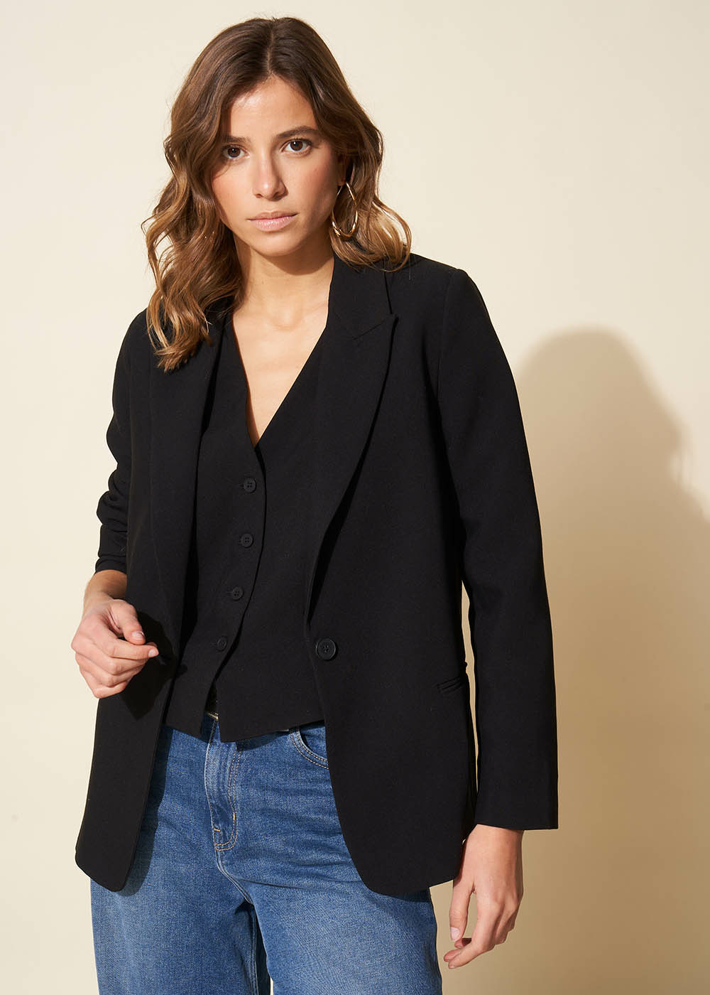 Le blazer VEDENA est un incontournable intemporel à ajouter à votre garde-robe. Il est caractérisé par ses poches passepoilées, ses poignets boutonnés et sa coupe cintrée. Avec ses manches longues et son col en V il offre une polyvalence adapté à différentes occasions. Cette pièce décontractée mais élégante vient compléter votre tenue avec style.
