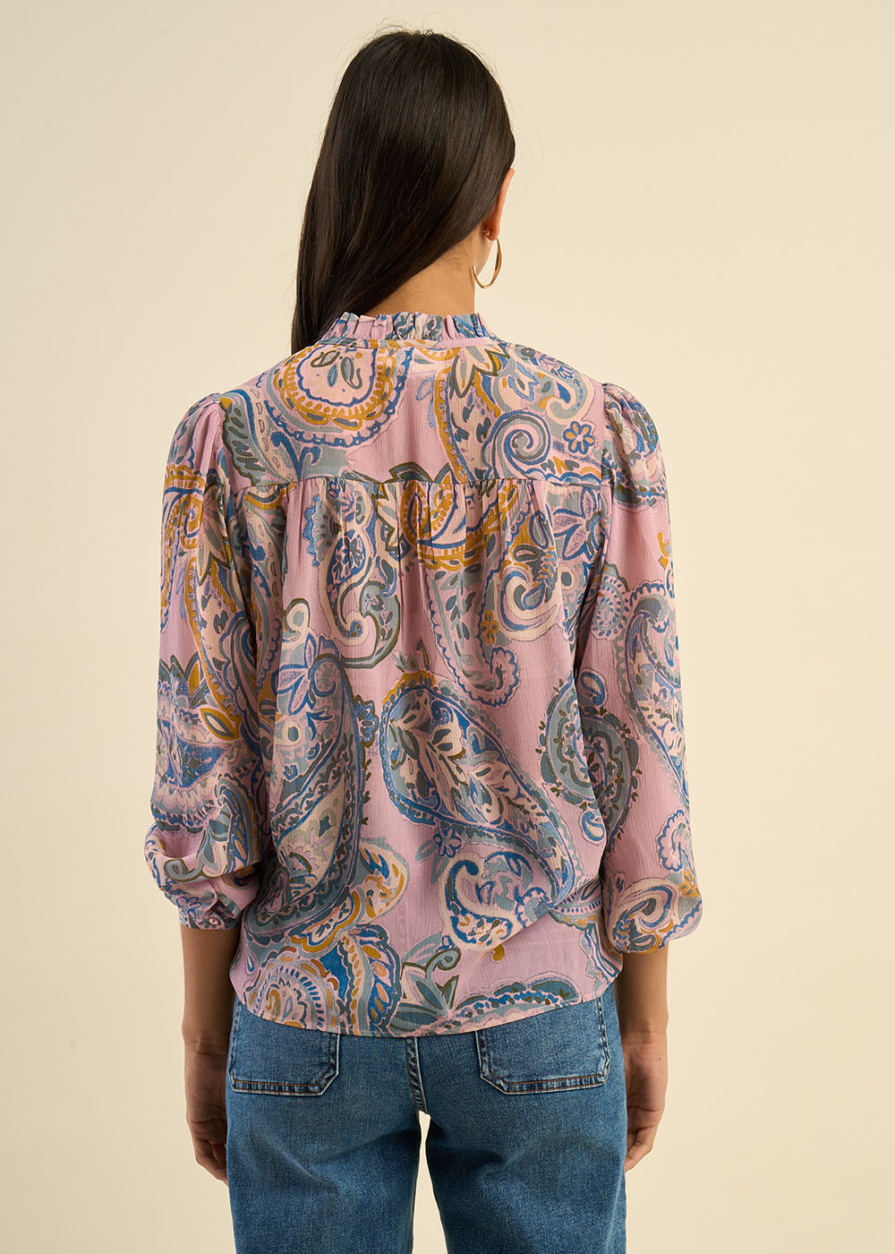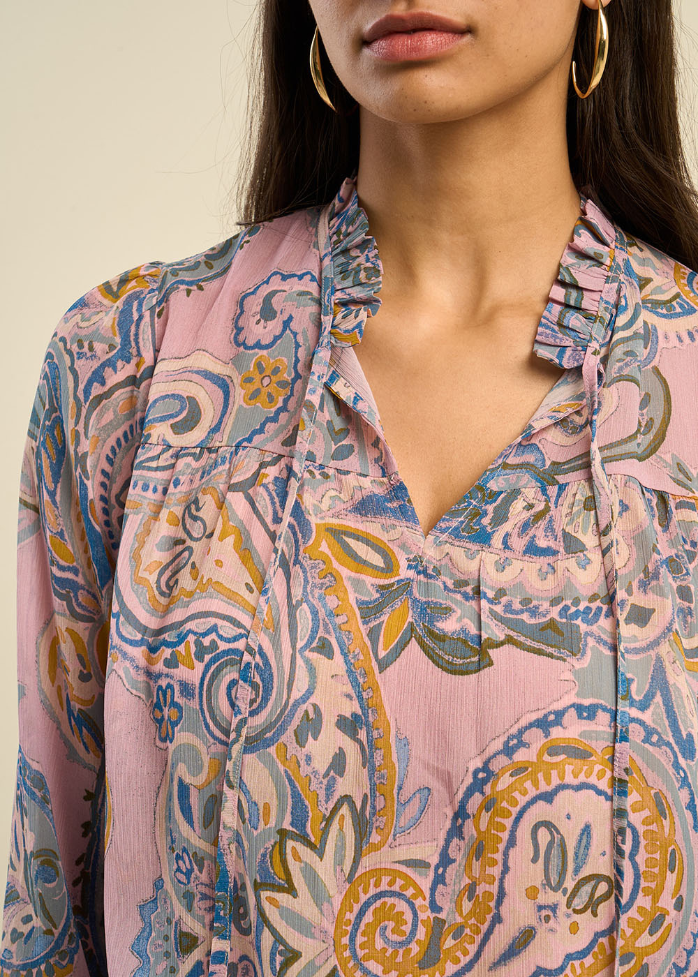Laissez-vous envoûter par notre blouse TALOUIZA, un top imprimé au motif cachemire, richement travaillé pour un effet élégant et raffiné. Confectionnée dans une matière fluide et agréable, cette blouse se distingue par son col tunisien orné de liens délicats et son joli détail volant qui apporte une touche de légèreté. Les manches longues, légèrement amples et resserrées aux poignets, ajoutent une dimension chic et moderne à ce modèle. Une pièce parfaite pour allier confort et féminité au quotidien.