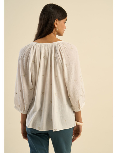 La blouse TAOMA, ample et fluide, séduit par ses délicates broderies en forme de trèfles, apportant une touche de raffinement et de douceur. Confectionnée en gaze de coton elle offre un confort absolu tout en restant élégante. Son col rond à encolure tunisienne nouée et ses manches longues ballon avec emmanchures raglan ajoutent une note bohème et féminine. Une pièce intemporelle qui insufflera charme et légèreté à votre dressing.