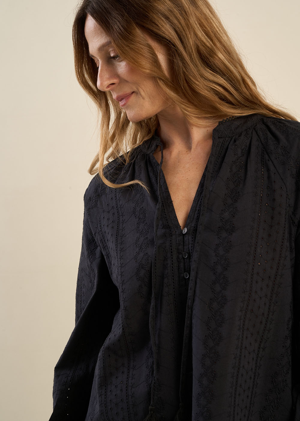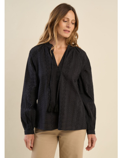 Succombez au charme de notre blouse TOBALO, agrémentée de délicates broderies anglaises qui lui confèrent une allure raffinée et bohème. Confectionnée dans une matière fluide et agréable à porter, elle se distingue par son encolure tunisienne boutonnée, sublimée par un lien orné de pompons. Ses manches raglan apportent une touche de légèreté et d’aisance, tandis que les détails travaillés au col viennent parfaire son élégance.