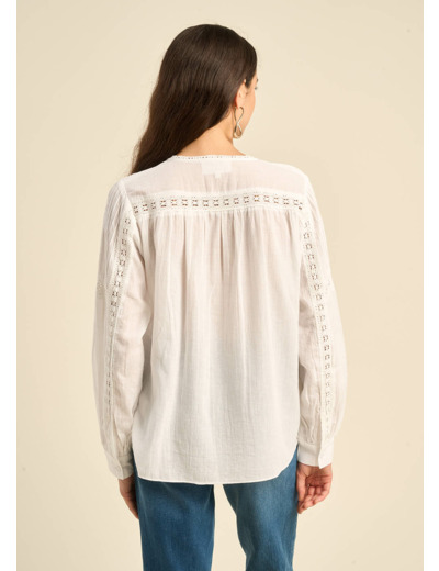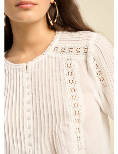La blouse TASMANA, une ode à la féminité bohème. Sa gaze de coton légère et fluide, associée à un col rond orné de 10 boutons, crée un look romantique et intemporel. Les plis piqués et le macramé délicatement appliqués sur le devant et les manches apportent une touche artisanale et unique. Les manches longues et larges, terminées par un poignet classique, confèrent une allure bohème chic.