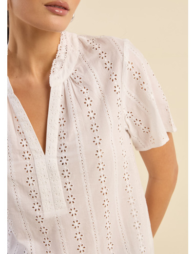 La blouse CILOUNA incarne l’élégance légère et romantique. Confectionnée en broderie anglaise, elle joue sur la transparence pour un effet raffiné et délicat. Son col légèrement volanté et son encolure fendue ajoutent une touche féminine et subtilement bohème. Avec ses manches courtes et sa coupe fluide, elle assure un confort absolu tout en structurant la silhouette avec douceur. Parfaite avec un jean ou une jupe légère, cette blouse est une alliée idéale pour un look chic et décontracté.