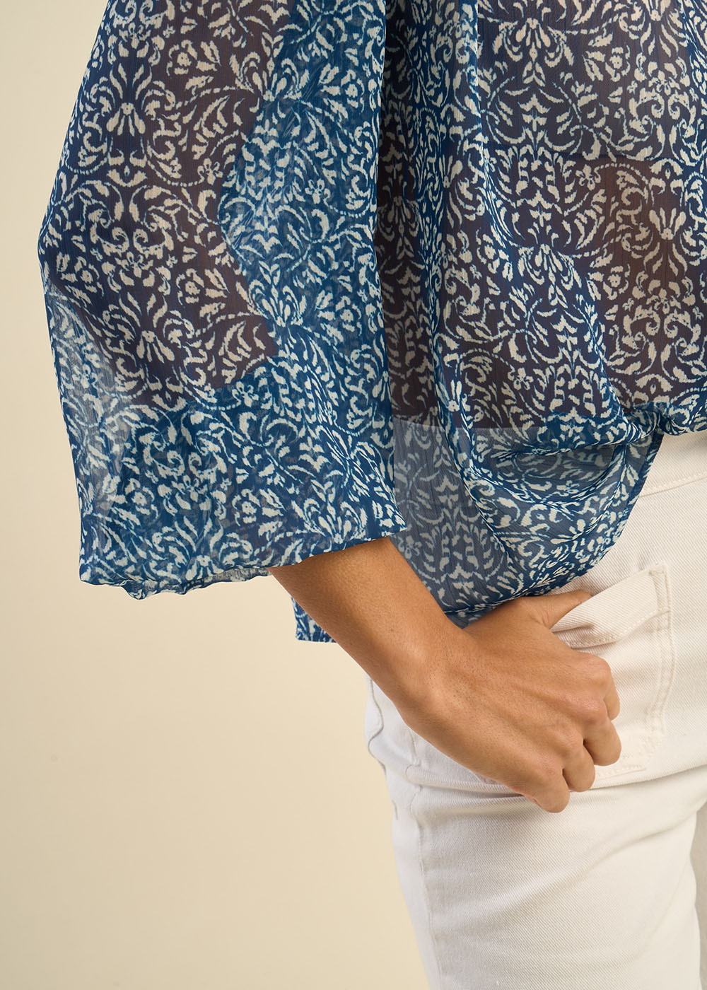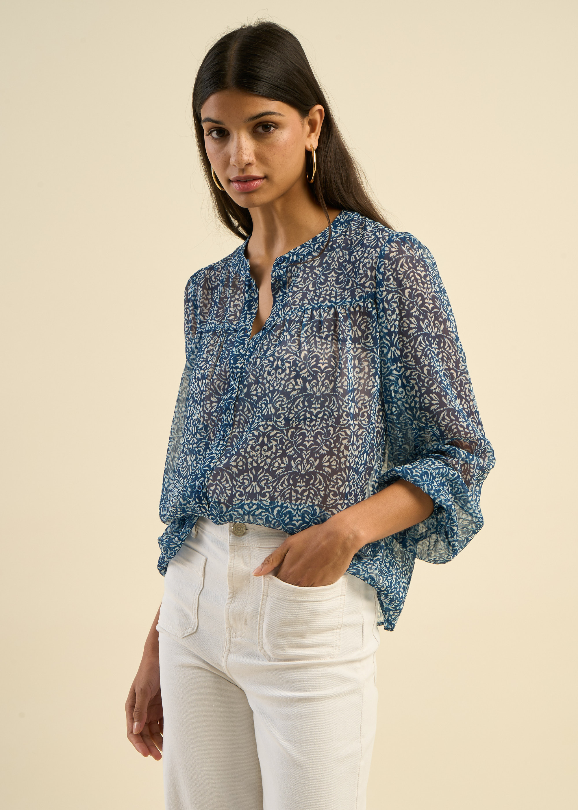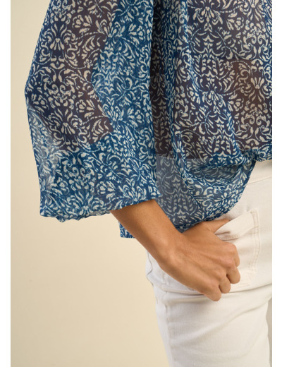 La blouse CAMONNA séduit par son charme délicat et son allure fluide. Confectionnée dans une matière légère à petit motif floral, elle offre un tombé aérien et féminin. Son col rond épuré et ses manches longues bouffantes apportent une touche de romantisme, tandis que sa coupe ample garantit confort et élégance. Dotée d'une fermeture boutonnée sur le devant, la blouse CAMONNA est parfaite pour compléter une tenue chic et décontractée.