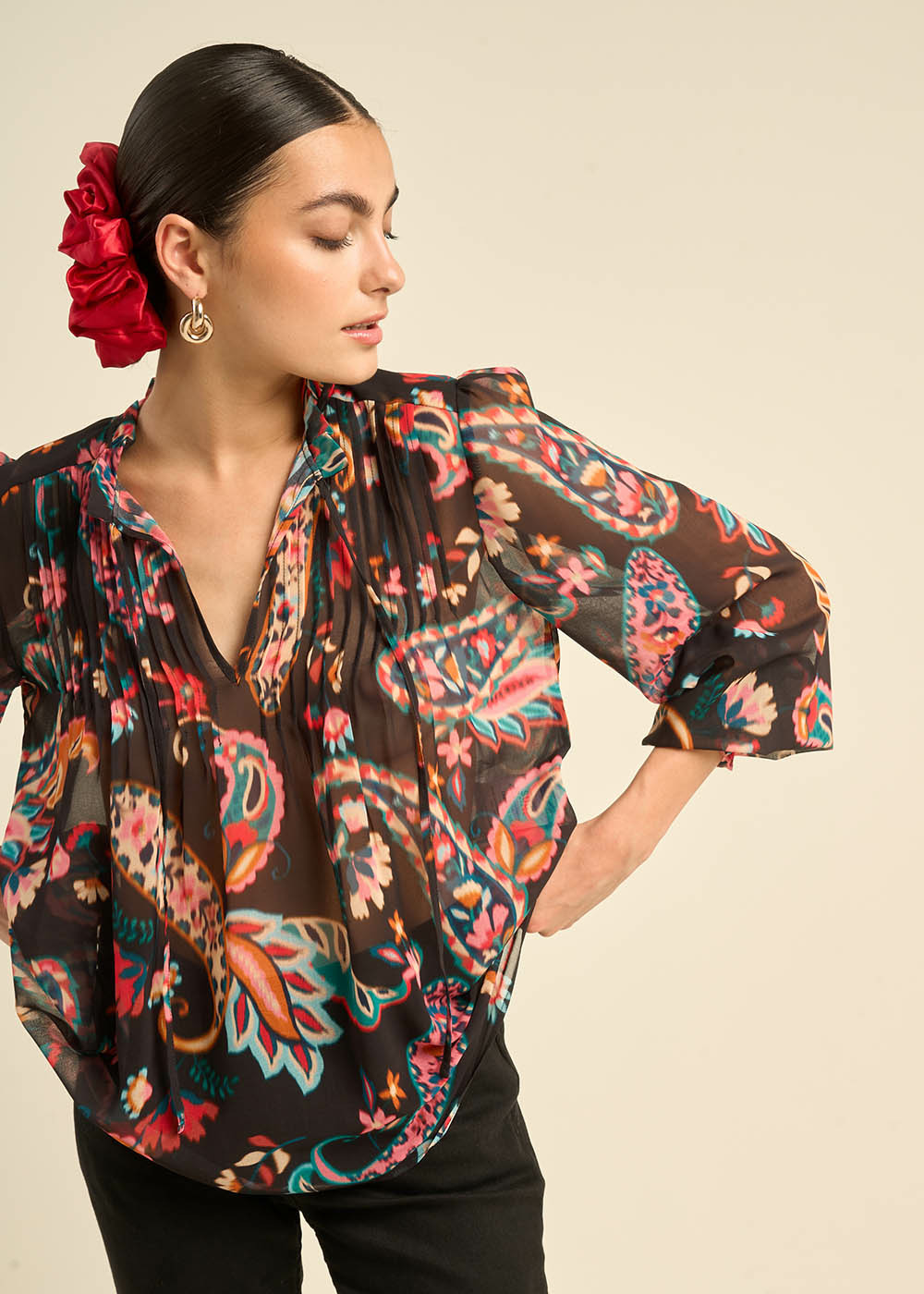 TASHEMIR, une invitation au voyage. Laissez-vous séduire par les motifs cachemire de cette blouse en voile de polyester, un subtil mélange de tradition et de modernité. La légèreté du tissu et les plis délicats créent une silhouette fluide et féminine. Associez-la à un jean flare et des sandales à talons pour un look bohème chic, ou à un pantalon taille haute et un blazer pour une allure plus sophistiquée.
