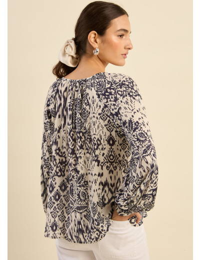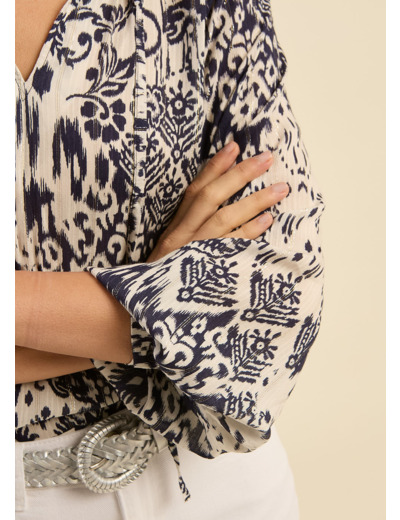 Laissez-vous séduire par notre blouse TOZAMA, imprimée aux motifs ikat bleu marine sublimés par des fils scintillants. Confectionné en viscose fibranne, un tissu léger et souple, elle offre un tombé fluide et une douceur agréable au porter. La rayure lurex intégrée dans le tissage apporte une touche de fantaisie et illumine l'imprimé.