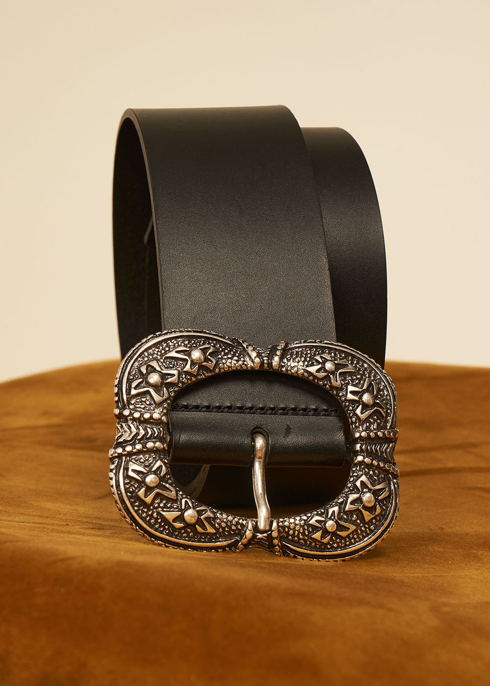 La ceinture CYRIELLE large en cuir est dotée d'une boucle fantaisie avec une finition argent vieilli qui ajoute une touche d'élégance et de caractère à l'ensemble. Elle peut être portée pour compléter une tenue décontractée ou pour ajouter une touche de style à une tenue plus habillée.