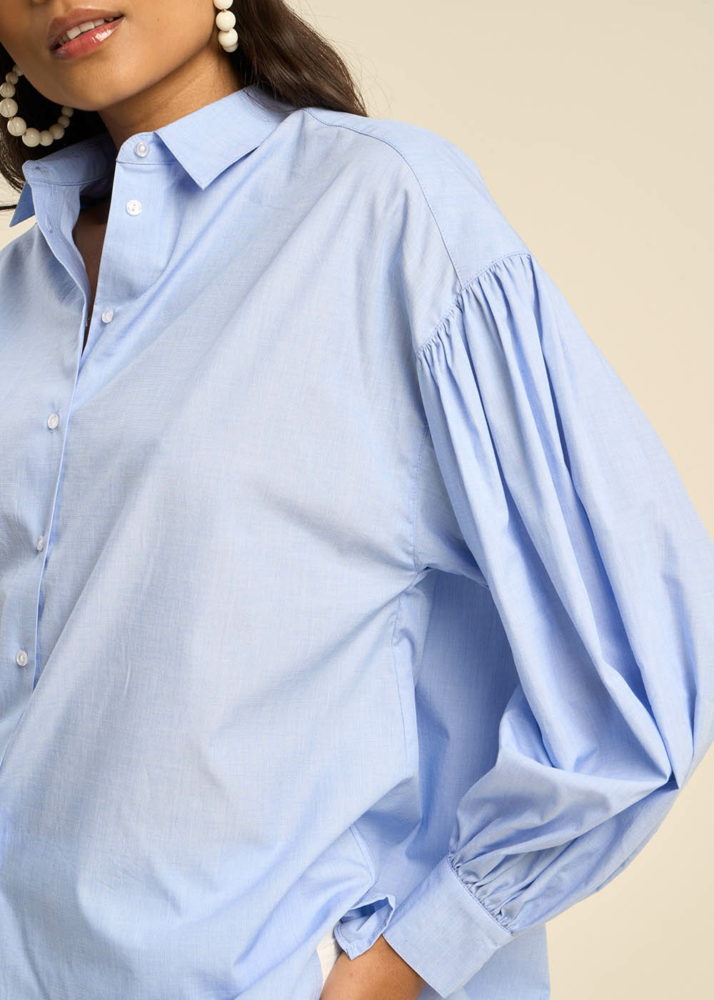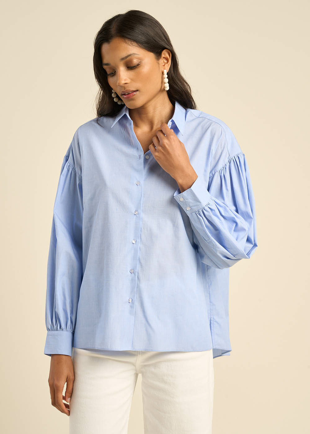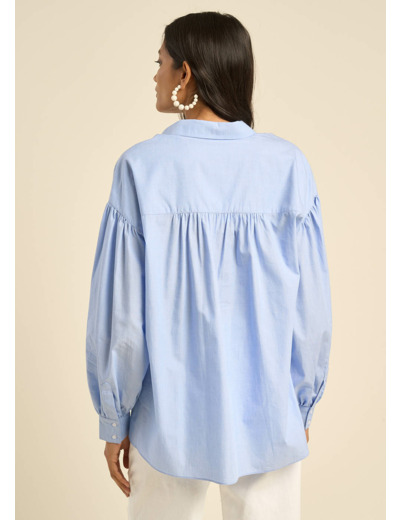 La chemise CATALINA en fils à fils bleu ciel est un éloge à l'élégance décontractée. Son col classique et ses manches longues bouffantes avec poignets ajoutent une touche de sophistication. Les découpes aux épaules et l'empiècement au dos créent une silhouette ample et volumineuse. Parfaite avec un jean écru ou medium stone, elle incarne le mariage idéal du chic et du confort.