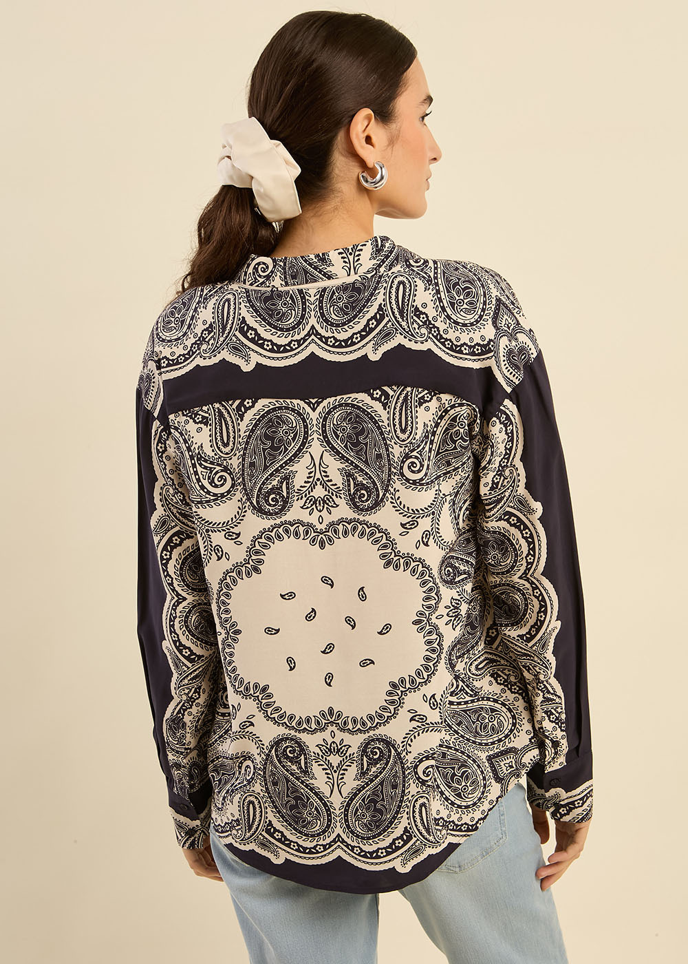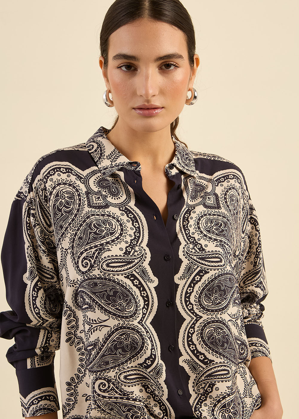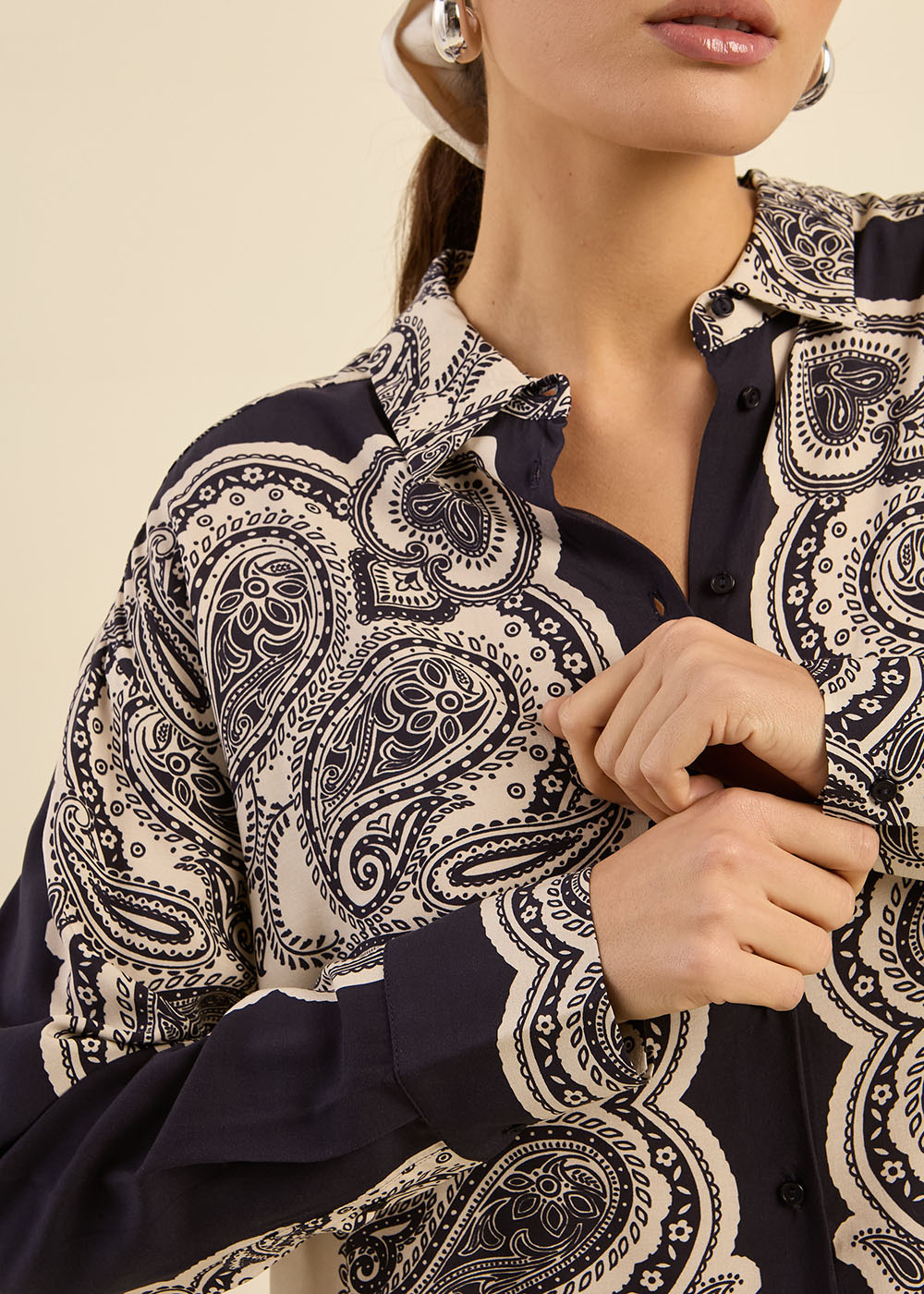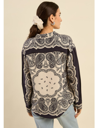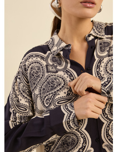 La chemise CANAKA séduit par son imprimé cachemire audacieux et sa coupe oversize, parfaite pour un look tendance. Confectionnée dans un tissu fluide, elle arbore un col classique, une patte de boutonnage centrale et des manches longues avec poignets boutonnés. Sa forme liquette arrondie apporte une touche féminine et moderne. Portez-la avec un pantalon en cuir pour une allure sophistiquée ou un jean droit pour un style casual chic.