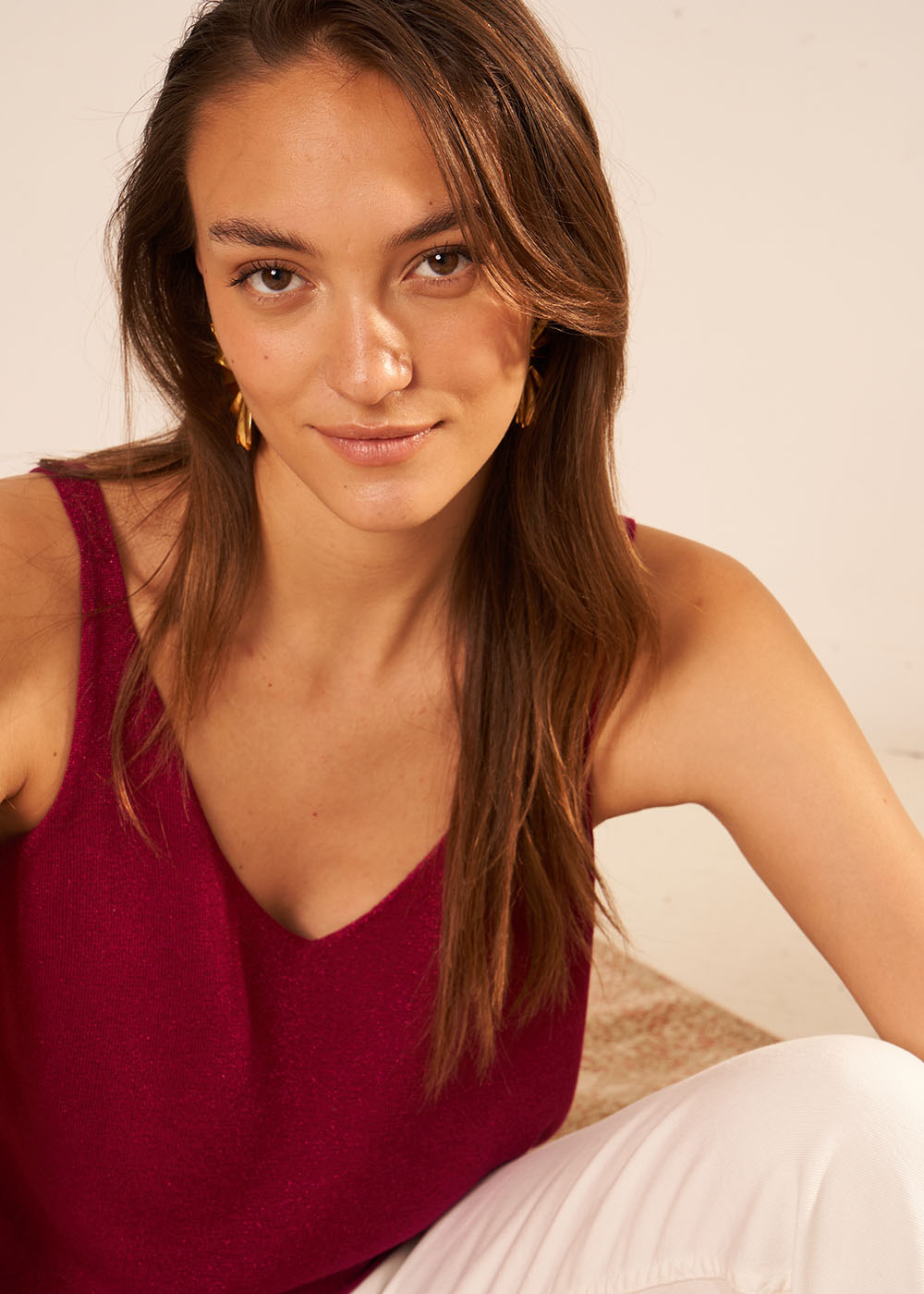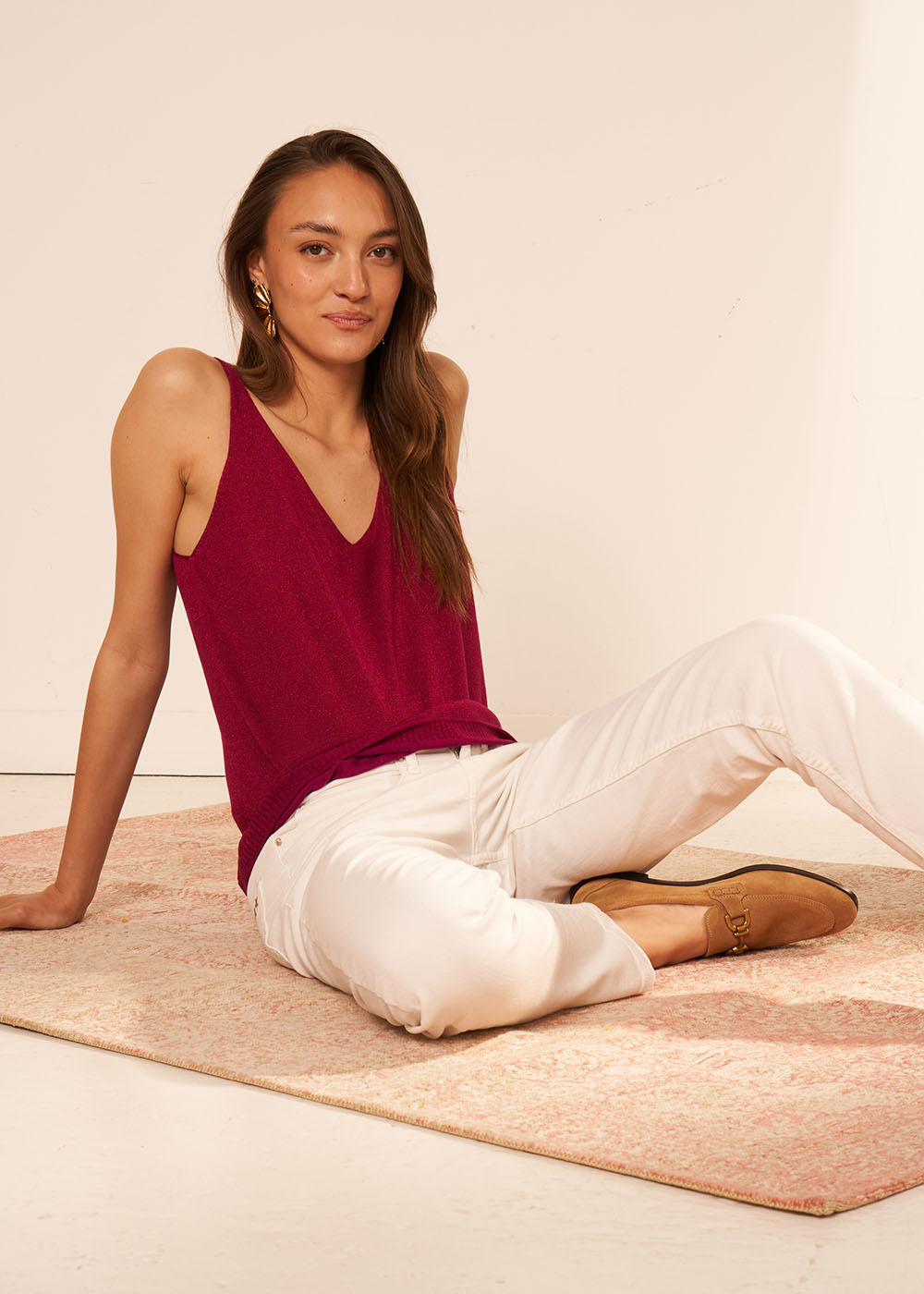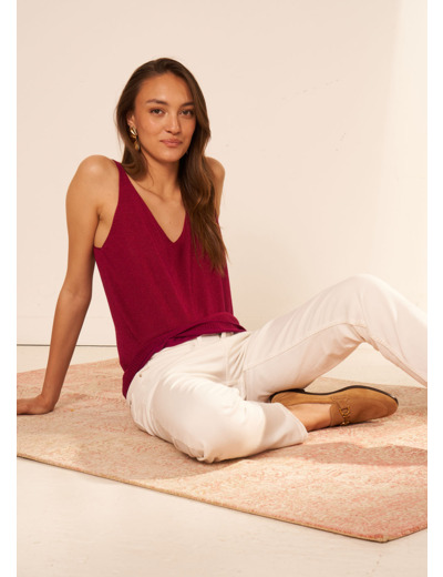 Ce débardeur à la coupe loose et à l'encolure en V allie aisance absolue allure et féminité. Composé d'une viscose fluide le top DEMOISELLES est orné d'un fil métallisé très doux qui glisse sur la peau. Ce débardeur col V à l'allure désinvolte habille tous vos basiques en un clin d'oeil et peut se porter en journée comme en soirée. Àvec ses fines bretelles et son dos échancré le débardeur DEMOISELLES joue la carte de la séduction tout en subtilité.