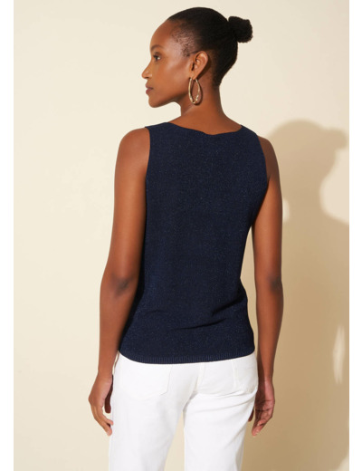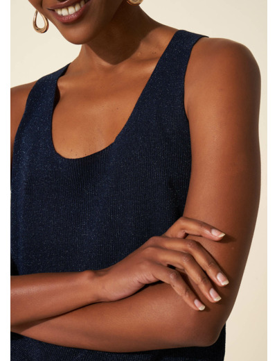 Le DIBA est un débardeur à encolure ronde fabriqué dans une maille scintillante grâce à l'utilisation de fibres métallisées. Avec une coupe moderne et ample il est adapté aussi bien pour des tenues décontractées que pour des looks plus chics