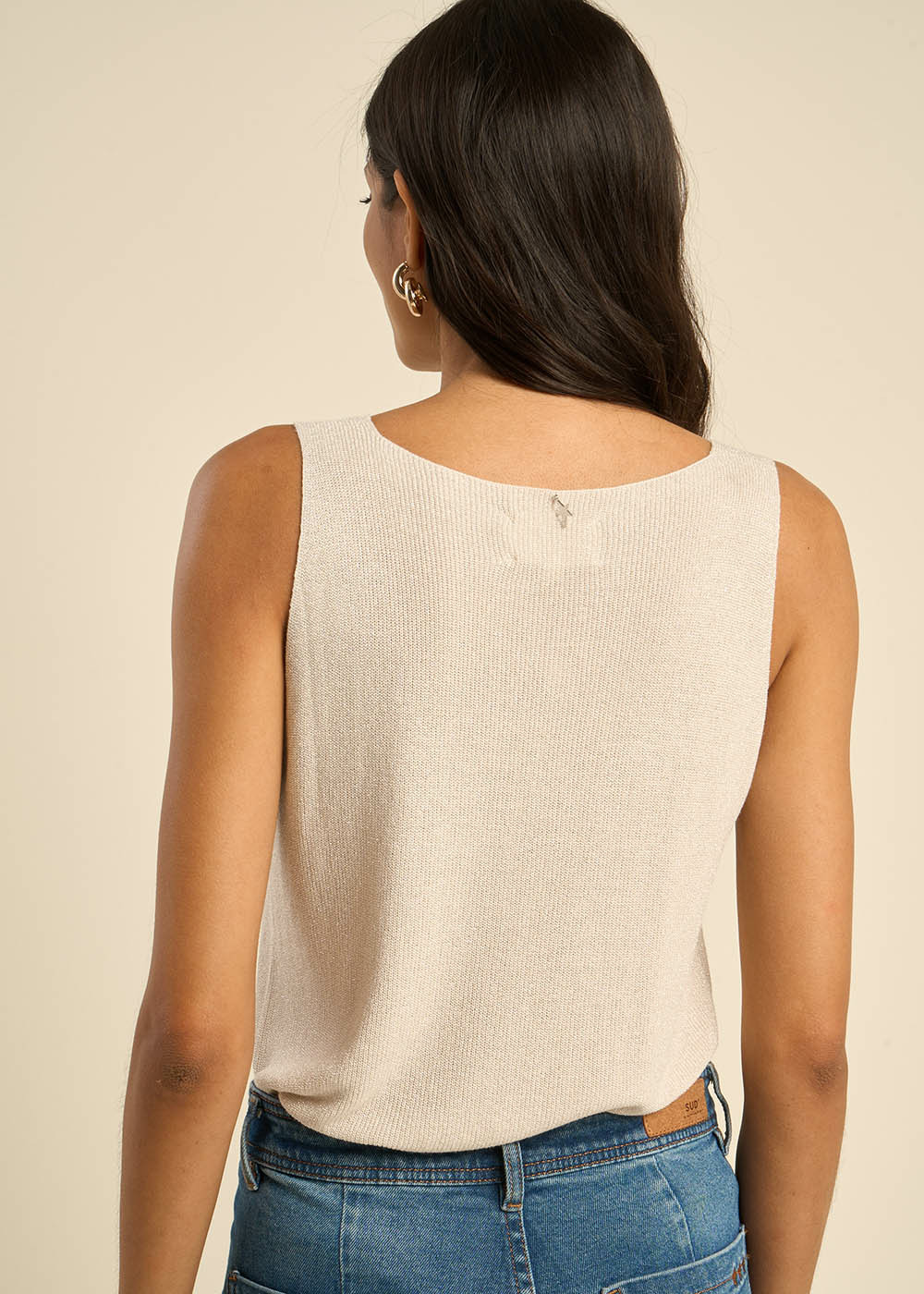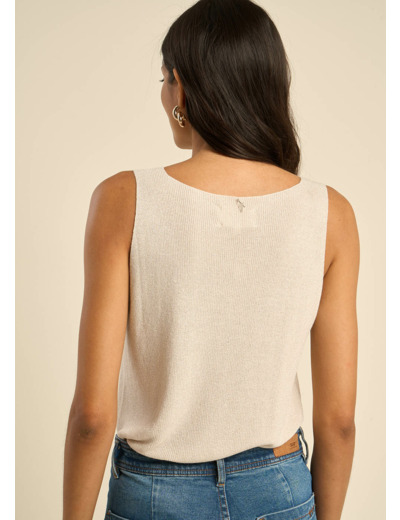 Le DIBA est un débardeur à encolure ronde fabriqué dans une maille scintillante grâce à l'utilisation de fibres métallisées. Avec une coupe moderne et ample il est adapté aussi bien pour des tenues décontractées que pour des looks plus chics
