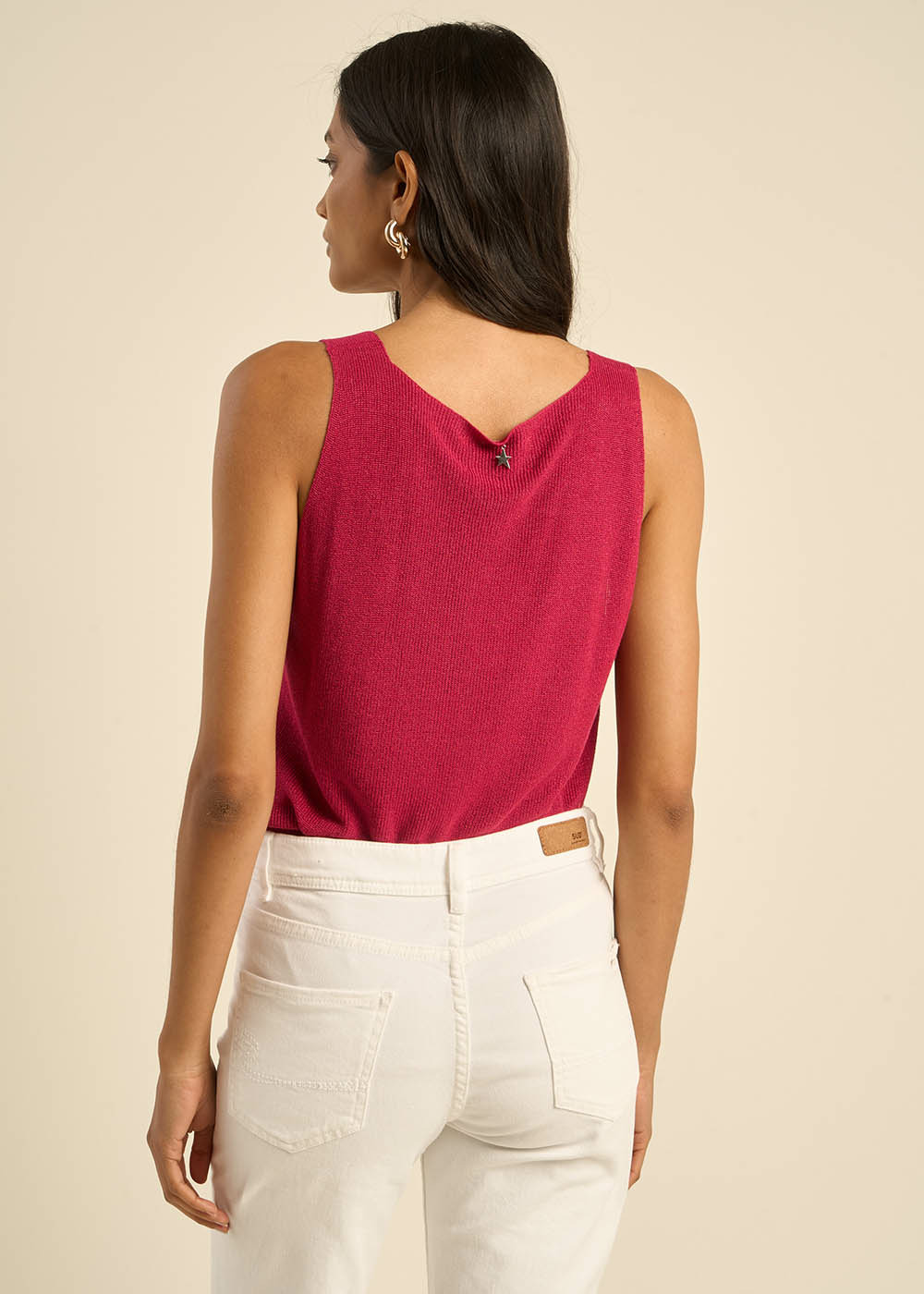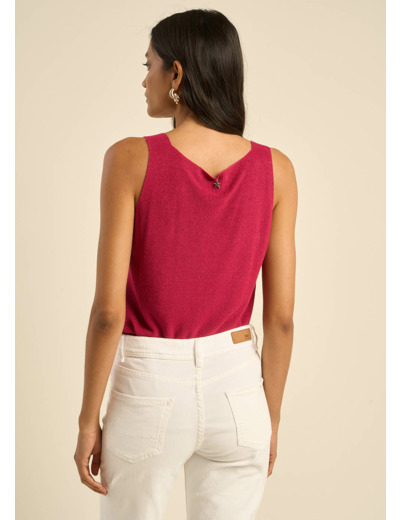 Le DIBA est un débardeur à encolure ronde fabriqué dans une maille scintillante grâce à l'utilisation de fibres métallisées. Avec une coupe moderne et ample il est adapté aussi bien pour des tenues décontractées que pour des looks plus chics