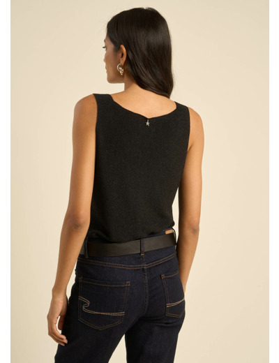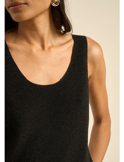 Le DIBA est un débardeur à encolure ronde fabriqué dans une maille scintillante grâce à l'utilisation de fibres métallisées. Avec une coupe moderne et ample il est adapté aussi bien pour des tenues décontractées que pour des looks plus chics