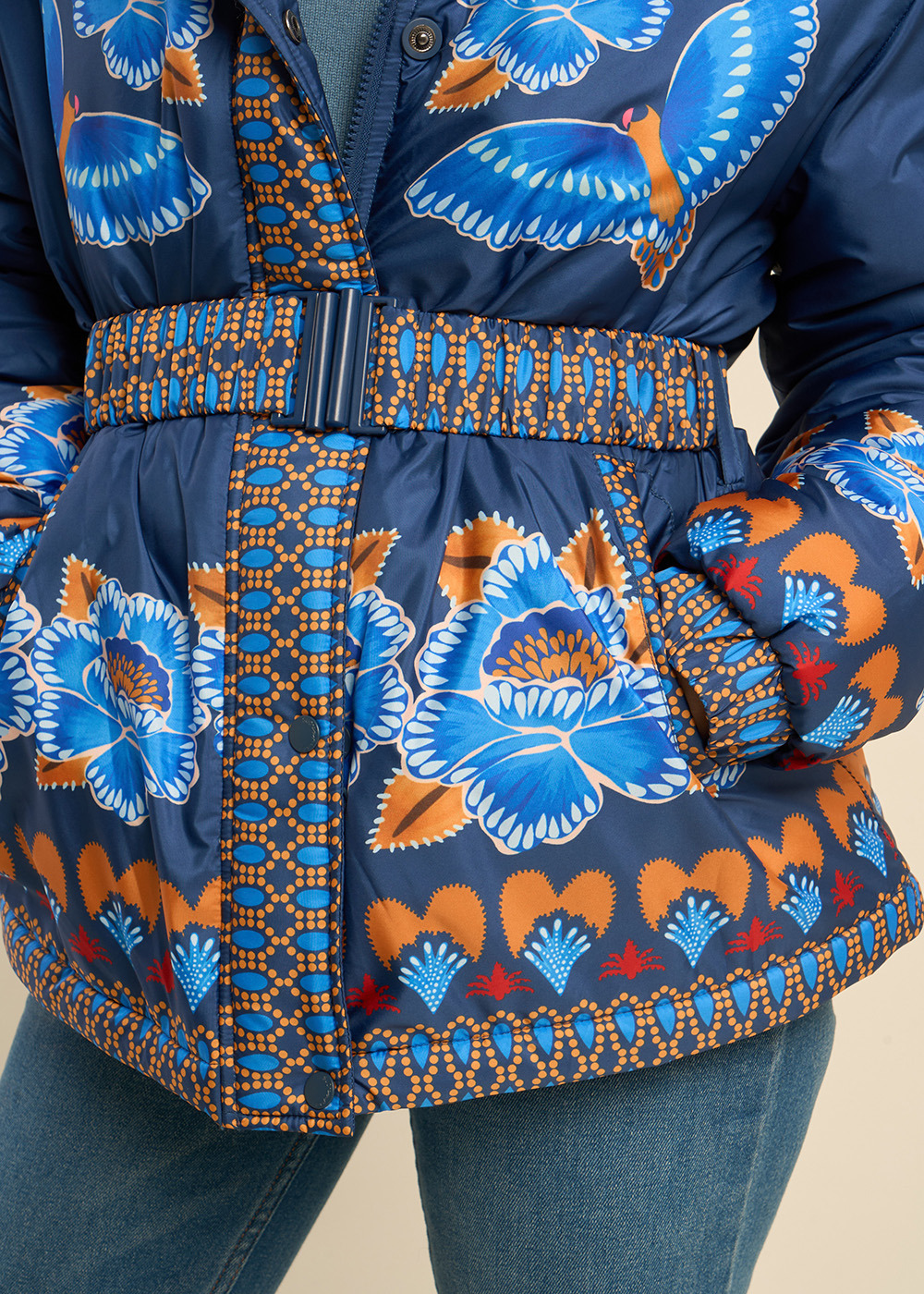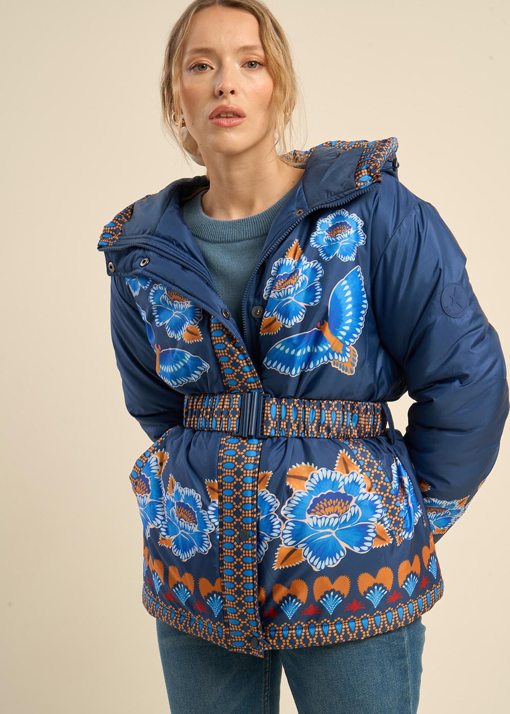 La doudoune DALEA se distingue par son imprimé original mêlant oiseaux et fleurs. Elle est équipée d'une capuche pour plus de chaleur, de poches sur les côtés pour plus de praticité, et de poignets élastiqués pour un ajustement confortable et sécurisé.