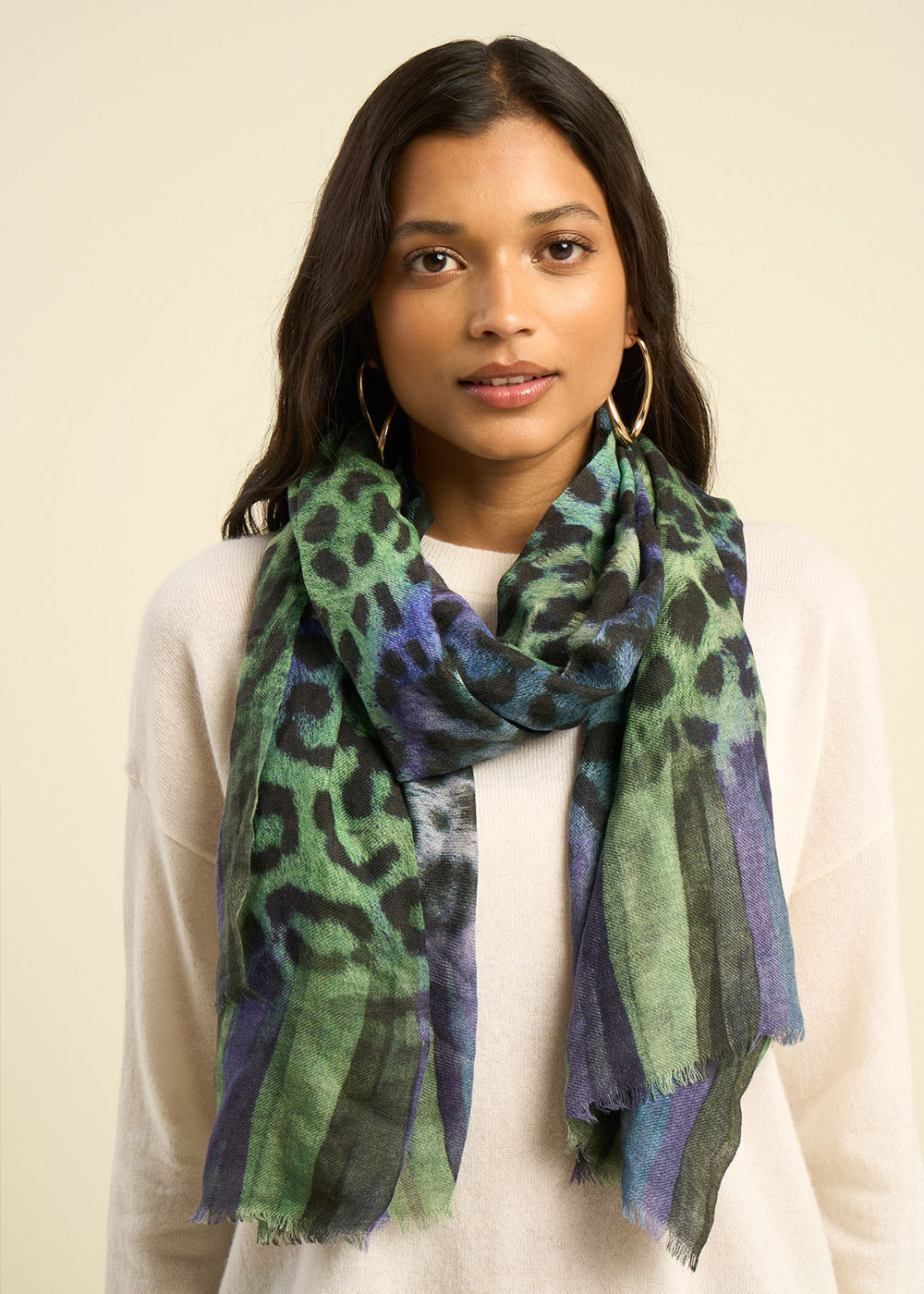 Le foulard imprimé EDESE est un accessoire chic en laine, avec une touche de soie, orné d'un motif léopard audacieux pour une touche de style coloré à votre tenue.